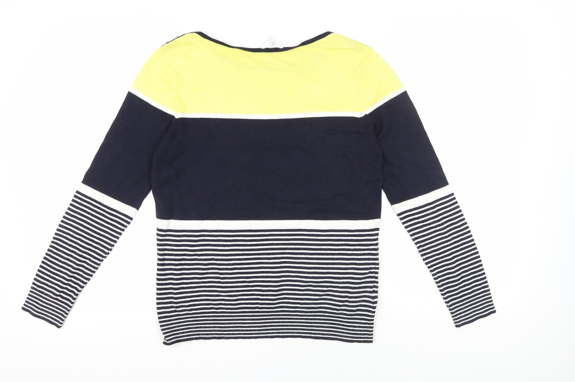 Elevate your wardrobe with this Women's Multicoloured Striped Pullover Jumper in a flattering medium size. The vibrant design harmoniously blends rich navy, crisp white, and sunny yellow hues, making it an ideal choice for both autumn and spring outings. Crafted from a comfortable blend of viscose and nylon, this jumper provides a soft touch against the skin while ensuring durability and a lasting fit. The classic boat neck elegantly frames the neckline, offering a sophisticated silhouette that pairs well with both jeans and skirts. Its long sleeves are perfect for keeping you cosy during cool mornings or evenings. Accented with fashionable buttons on the shoulders, this striped pattern jumper effortlessly combines style with versatility. Not just for casual occasions, the timeless design allows for a seamless transition to more formal settings, lending a chic touch to any ensemble. While the knit fabric type enhances stretch, maintaining its form, the regular fit ensures comfort throughout the day. This jumper, despite being previously owned, is in excellent condition with minimal signs of wear and no original sale tags. Its condition reflects the high quality maintained, making it a bargain addition to your collection. Whether you're heading to a casual brunch or an evening get-together, this piece promises to complement your outfit with ease and elegance, making it a must-have staple for the stylish woman. Don't miss the chance to own this exquisite jumper that combines both comfort and flair, perfect for those seeking to make a subtle fashion statement.