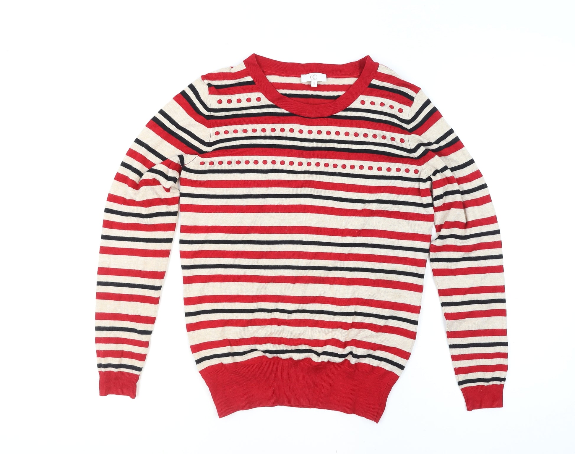 Add timeless charm to your wardrobe with this CC Women's Red Striped Pullover Jumper in size Small. Crafted from a soft and breathable blend of viscose and nylon, this lightweight knit offers excellent comfort and a flattering regular fit. The jumper features a classic crew neckline and long sleeves, making it ideal for layering in the cooler months or wearing on its own for transitional weather. The bold red, black, and cream stripe design adds vibrant personality while maintaining a stylish, casual appeal. Perfect for pairing with jeans, skirts, or tailored trousers, this piece effortlessly suits both relaxed weekends and smart-casual outings. Designed for women who appreciate both quality and everyday versatility, this piece offers a blend of durability and softness, ensuring it remains a go-to favourite season after season. Machine washable for easy care, this jumper embodies functional fashion with enduring style. Finished with ribbed cuffs and a hem to retain its shape, it presents a polished silhouette suitable for spring and autumn wear. While showing minimal signs of previous use, it remains in excellent condition with no visible damage or flaws, representing great value for those seeking classic knitwear from a trusted label. Whether dressed up or down, this CC jumper promises all-day comfort, timeless design, and effortlessly chic style — a wardrobe essential for any woman's collection.