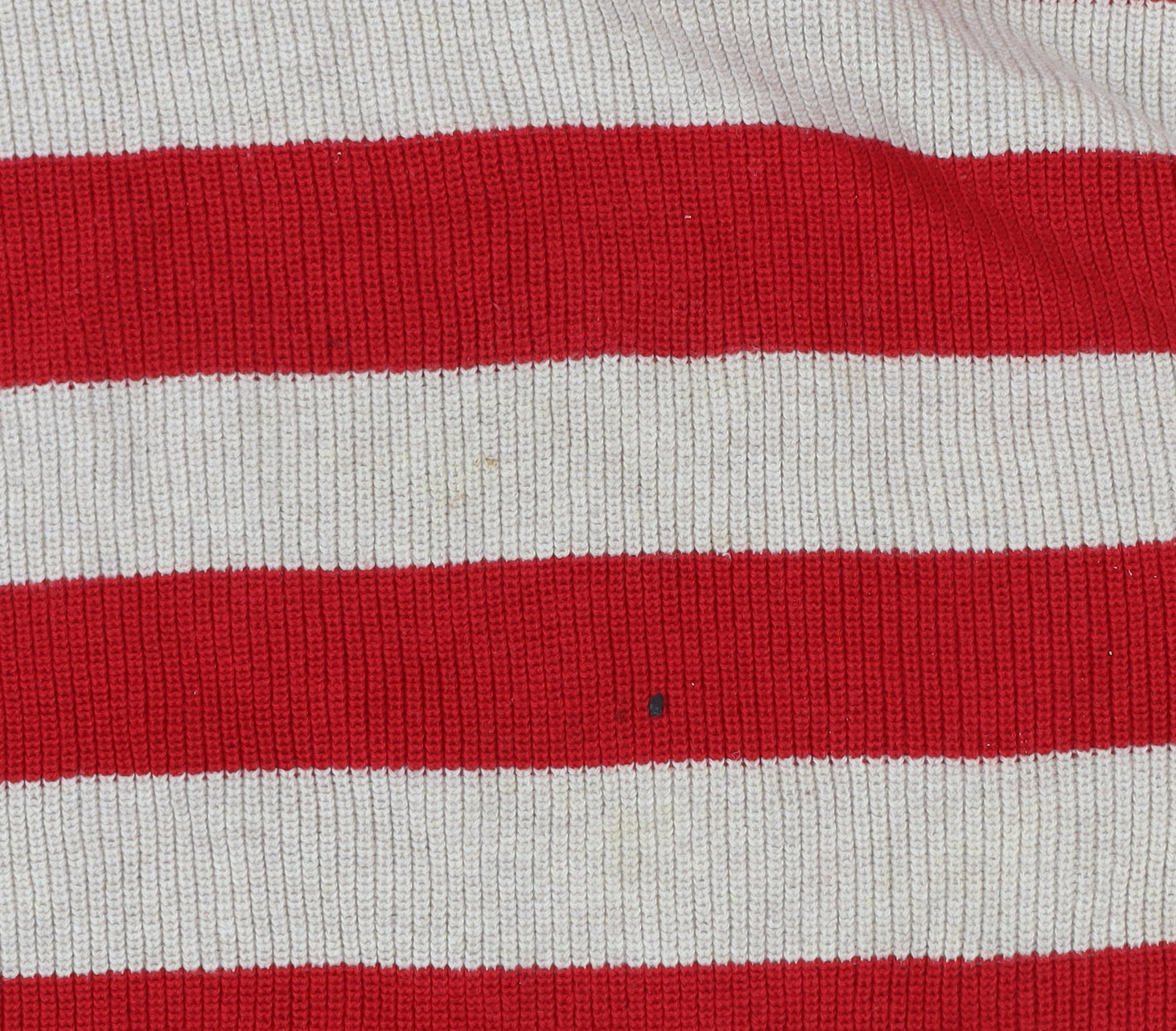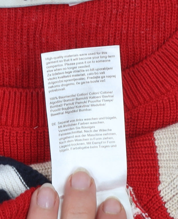Add a touch of effortless casual style to your wardrobe with this classic Cecil men’s pullover jumper. Crafted from 100% cotton for a soft and breathable feel, this jumper combines comfort with timeless appeal. The bold horizontal stripes in red, beige, and navy create a distinctive, nautical-inspired look, perfect for relaxed weekends or layering through cooler seasons. The crew neckline and long sleeves keep the silhouette simple yet versatile, while the ‘Team United’ embroidered logo accent adds a subtle branded detail near the hem.Designed in a lightweight, tight-knit cotton fabric, this jumper ensures year-round wearability, making it suitable for autumn, spring, and mild winter days. The regular fit offers easy movement and layering potential, pairing well with chinos or jeans for a laid-back everyday outfit. Its knitted texture not only enhances warmth but also provides a visually appealing finish that elevates any casual ensemble.Although lightly used, the jumper remains in good overall condition with some small signs of wear including a minor hole under the arm and gentle fabric wear, both reflected in the price. Durable cotton construction ensures lasting comfort and ease of care—machine washable for everyday convenience.Perfect for men seeking a comfortable and stylish cotton knit that balances quality with a relaxed aesthetic, this red and beige striped jumper by Cecil makes a great wardrobe addition. Whether worn at home, out on a walk, or layered under a casual coat for cool weather, it’s a piece that delivers reliability, comfort, and timeless appeal.