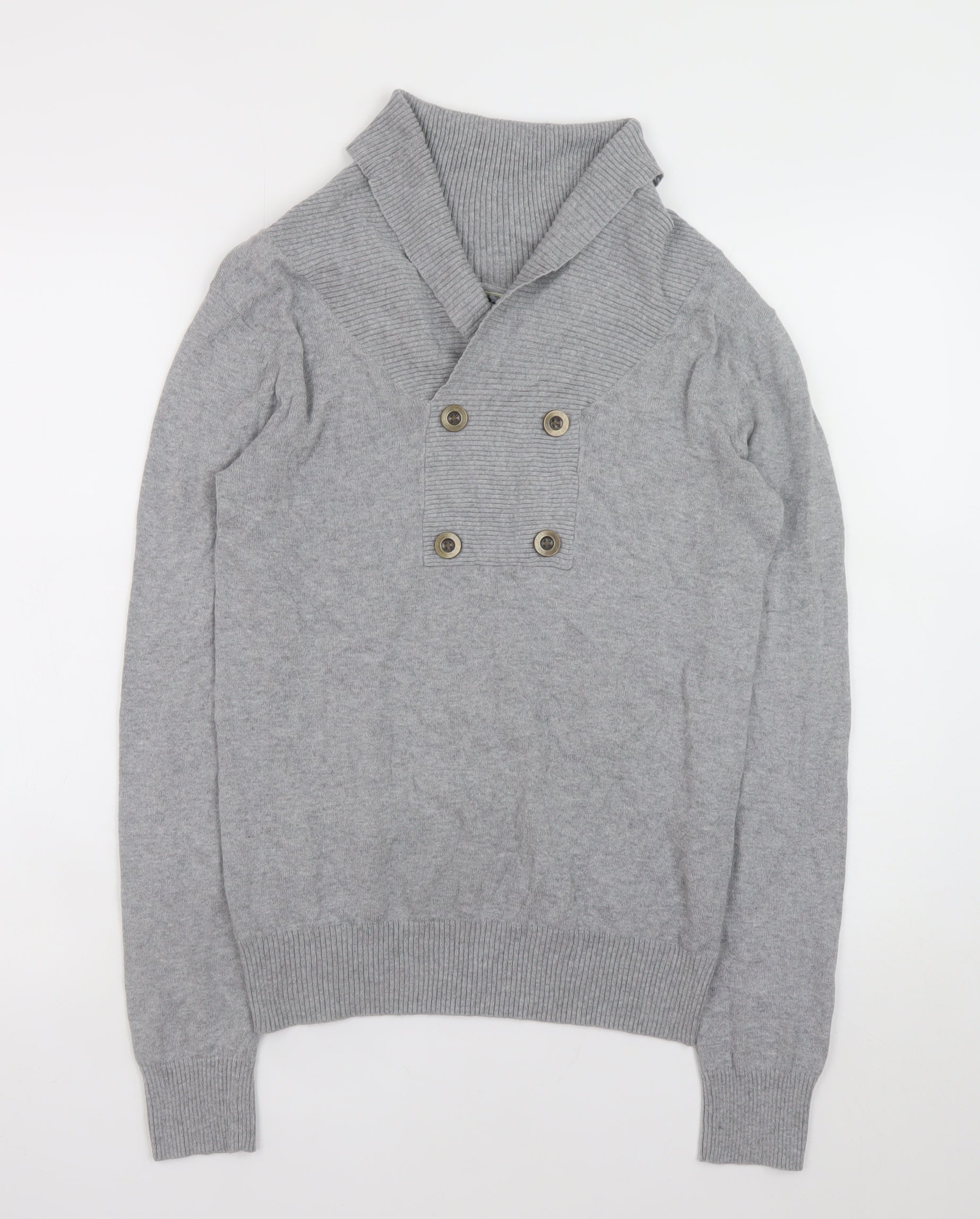 Men’s Grey Cotton Shawl Collar Button Jumper Size S