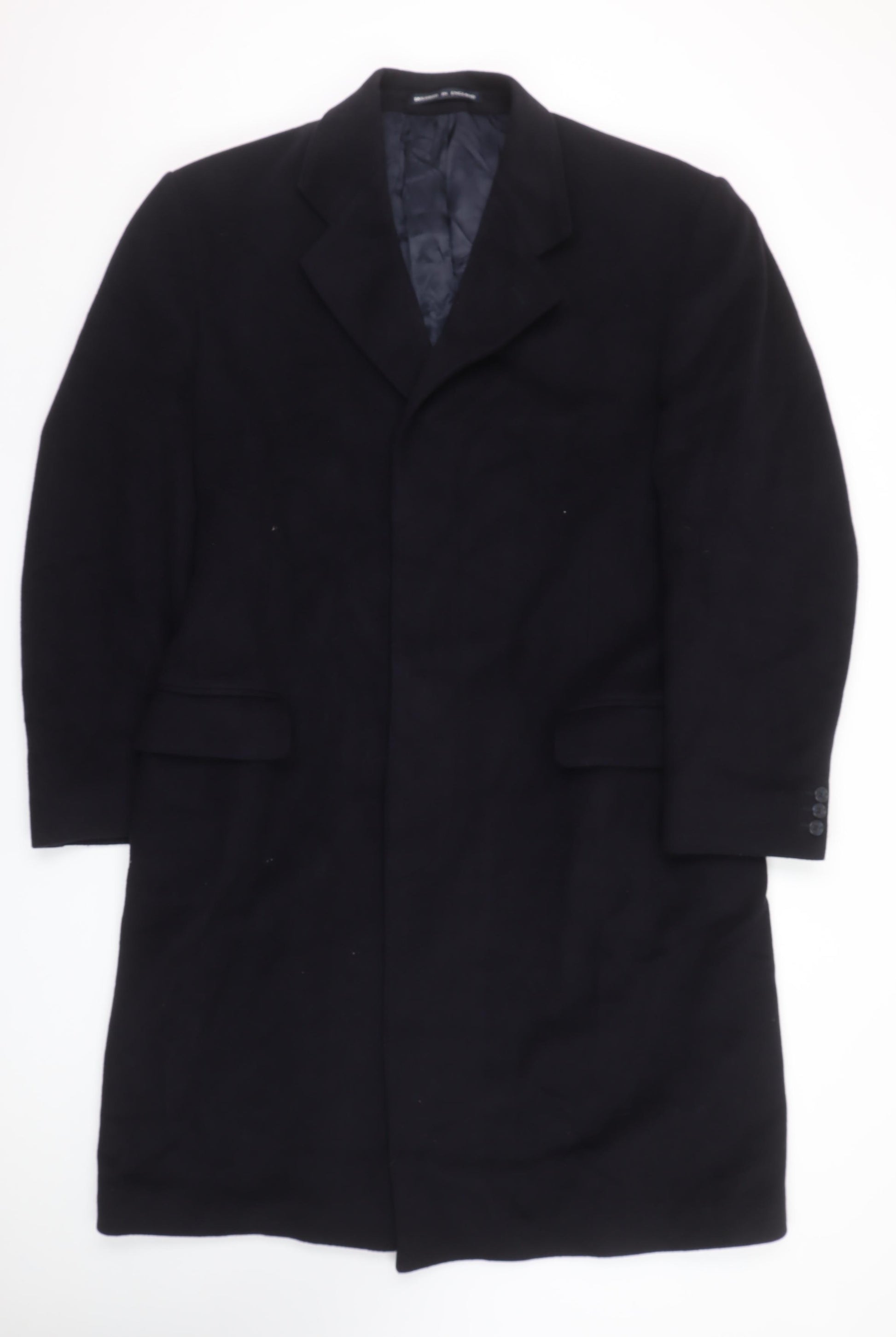 This sophisticated Centaur men's black wool overcoat combines timeless British tailoring with a classic silhouette, perfect for the discerning gentleman. Expertly tailored in England, this coat is constructed from high-quality wool, featuring a soft yet durable outer shell that provides both warmth and comfort during the cooler months. Fully lined with a smooth polyester interior, it ensures a refined finish inside and out. Designed in a traditional overcoat style, the coat features a single-breasted closure with button fastening, a structured notched lapel collar, and neatly flapped front pockets for both practicality and polish. The long length offers excellent coverage and pairs effortlessly with business or formal attire, making it an ideal choice for autumn and winter wear. The classic black colour adds versatility, allowing it to complement a variety of ensembles with ease. The fit is regular, suitable for men aiming for a tailored yet comfortable structure. This piece embodies timeless elegance and British craftsmanship, making it perfect for business meetings, formal events, or everyday professional wear. Condition is rated Excellent with only minor lint from previous wear, reflecting careful use and preservation of the garment’s refined appearance. Its fine detailing, durable materials, and expert craftsmanship ensure it will remain a staple piece in your wardrobe for years to come. A great choice for those seeking an understated but distinguished look. Purchase this Centaur overcoat today to add a layer of class and comfort to your wardrobe.