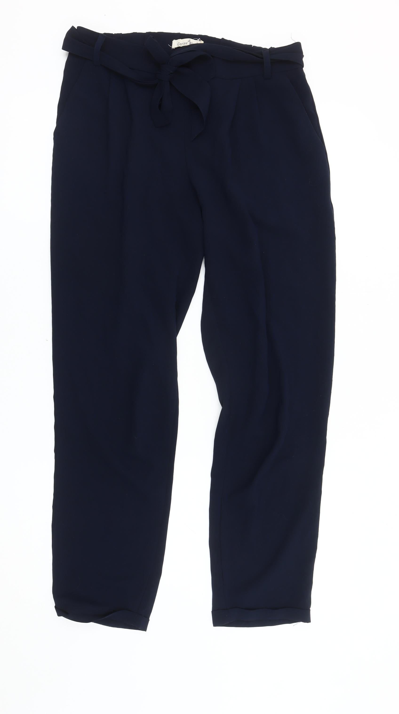 These stylish Cerise Blue women's trousers in medium size offer a chic paperbag style, perfect for a casual setting. Crafted from a comfortable blend of 65% polyester and 35% viscose, they provide durability and breathability for everyday wear. Featuring a trendy tie closure and a flattering high-rise fit, these trousers are both fashionable and functional. The belted design accentuates the waist, enhancing the relaxed fit for a sophisticated silhouette. The deep blue colour complements various tops, making it a versatile addition to your wardrobe. Machine washable for easy care, these trousers are ideal for women seeking a blend of comfort and style. Upgrade your collection with this modern and elegant piece today!