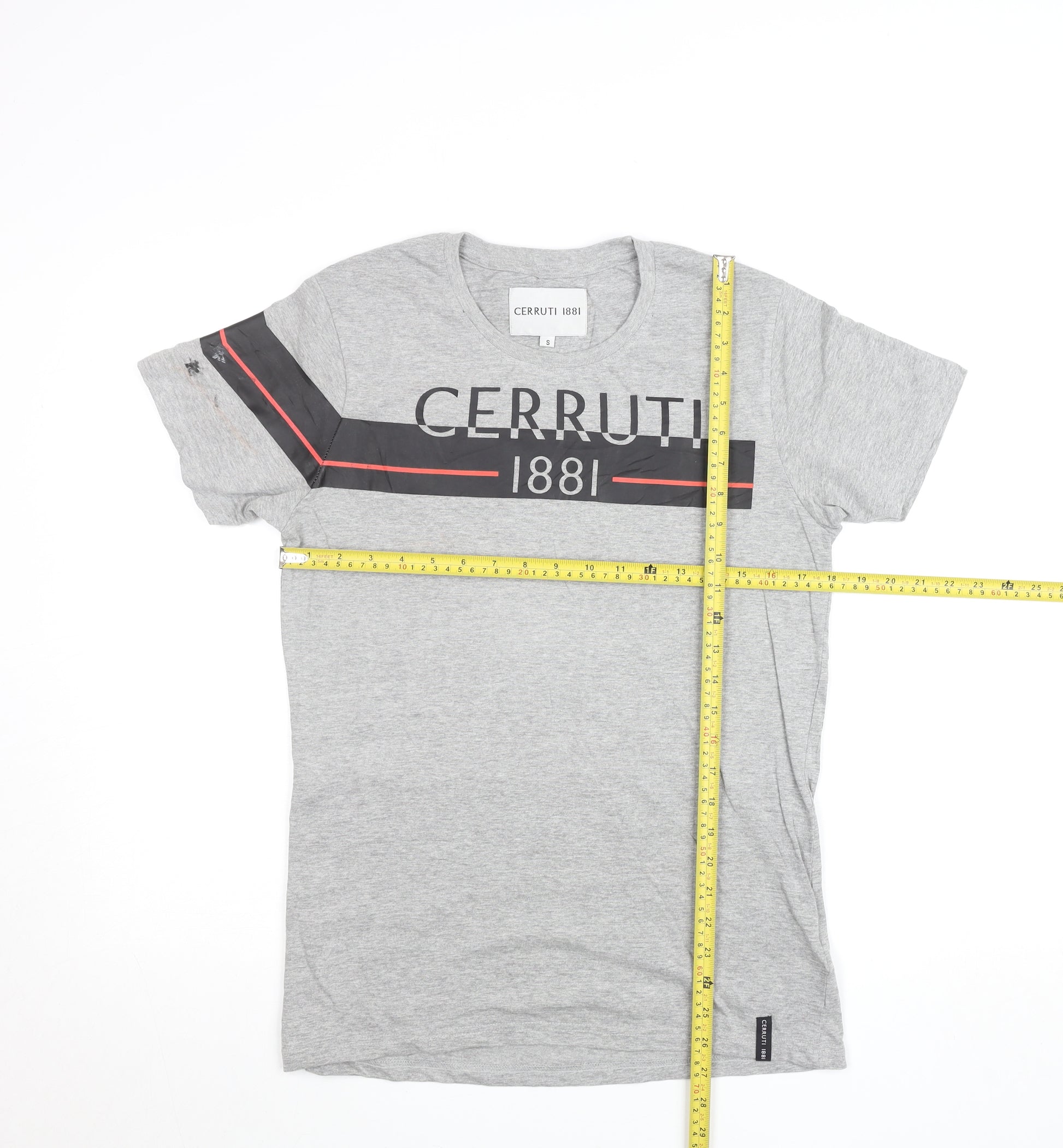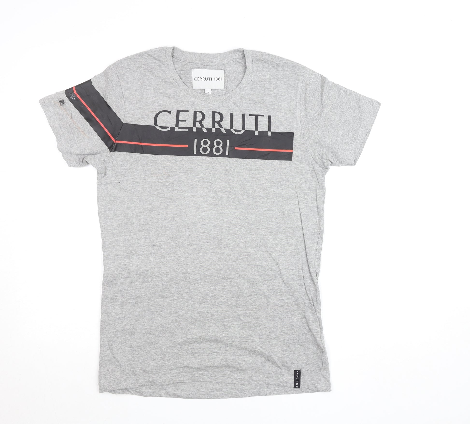 This Cerruti 1881 men’s grey T-shirt delivers effortless designer sophistication fused with casual comfort. Constructed from 100% soft Jersey cotton, this lightweight, breathable fabric ensures all-day ease, ideal for layering or wearing solo. The short sleeves and classic crew neckline provide a timeless shape that flatters every build while maintaining versatility across smart-casual and relaxed settings. The front proudly features the iconic Cerruti 1881 logo set against sleek black and red accent stripes across the chest and sleeve, giving it an instantly recognisable designer finish with subtle contrast detailing for a modern twist. Perfect for everyday wear, this T-shirt works seamlessly with denim, chinos, or casual shorts, making it a wardrobe essential for those who appreciate understated luxury. Made in India, it showcases the quality craftsmanship associated with the Cerruti name, combining heritage and contemporary urban style. Though lightly used, the garment remains in very good condition with only a minor mark on one sleeve, reflected fairly in the price. This refined grey Cerruti 1881 T-shirt is ideal for warm spring and summer outings yet also layers easily under jackets during cooler months. Whether you are dressing for a laid-back weekend or smart casual meet-up, this piece captures effortless European style rooted in modern sophistication and classic minimalist appeal, ensuring comfort and confidence wherever you go. A perfect balance between premium design and everyday versatility, the Cerruti 1881 T-shirt guarantees timeless wear.