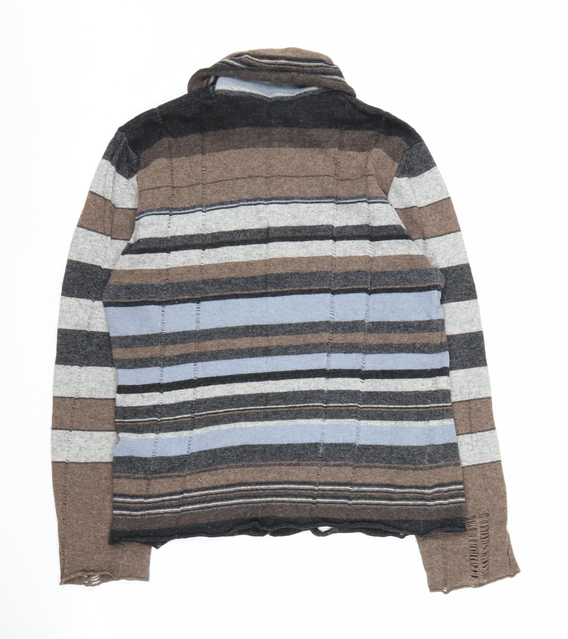 Embrace the subtle elegance and warmth of this Cerruti women's pullover jumper, crafted for those chilly autumn and winter days. The multicoloured striped pattern seamlessly blends hues of brown, blue, and grey, offering a versatile look that complements various styles. This medium-sized, regular fit jumper is perfect for casual occasions or a relaxed day out. Made from a premium blend of wool, nylon, viscose, and cashmere, it promises both comfort and durability. The roll neck design adds a touch of sophistication, ensuring you stay cosy while looking chic. A chunk-knit fabric provides added texture and depth to your ensemble. Despite slight fabric wear, which is typical of gently used clothing, this jumper remains in excellent condition. Pair it with your favourite jeans or a sleek skirt to enjoy both style and comfort. Add this Cerruti creation to your wardrobe and experience a harmonious blend of quality and design.