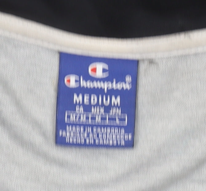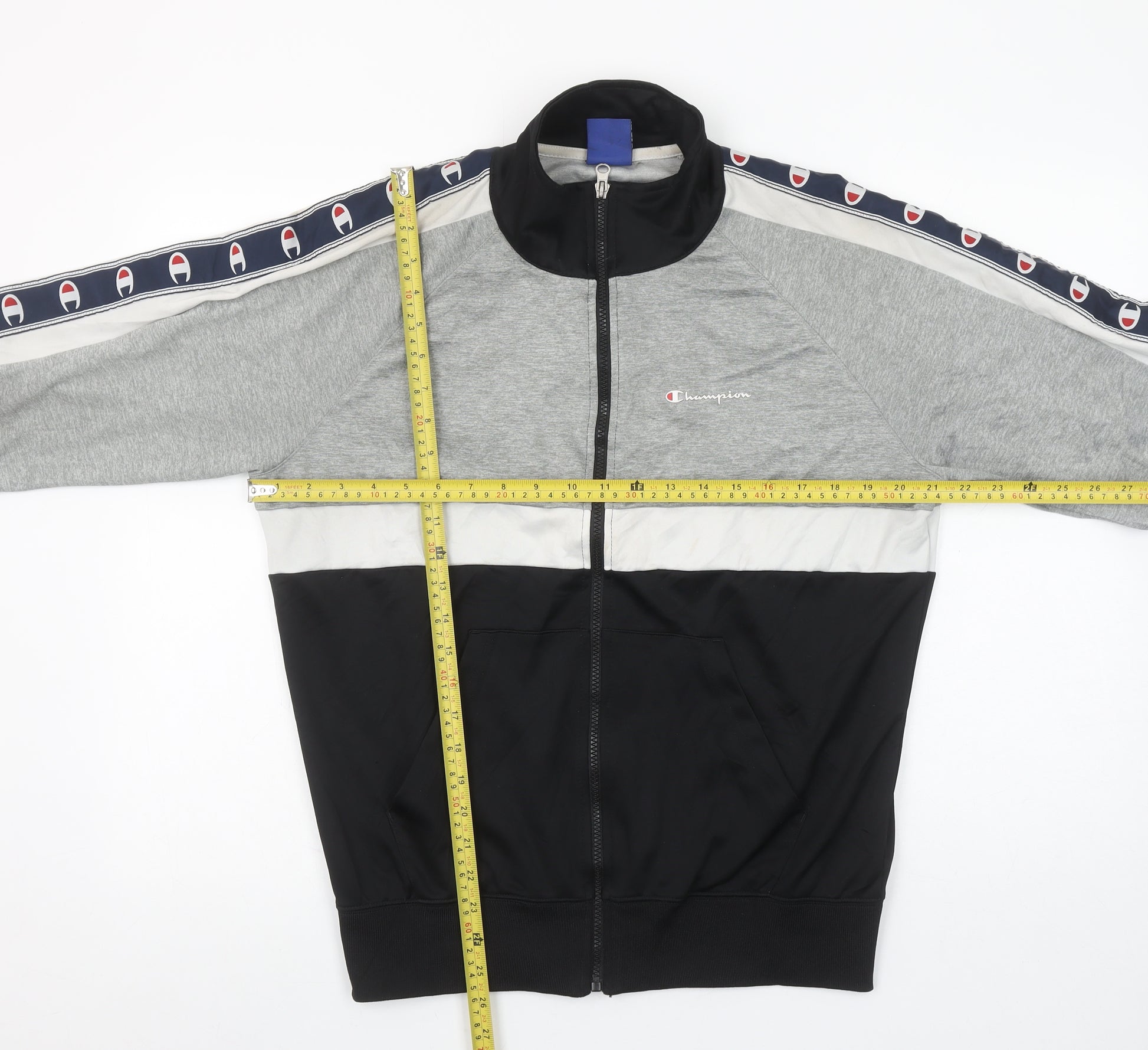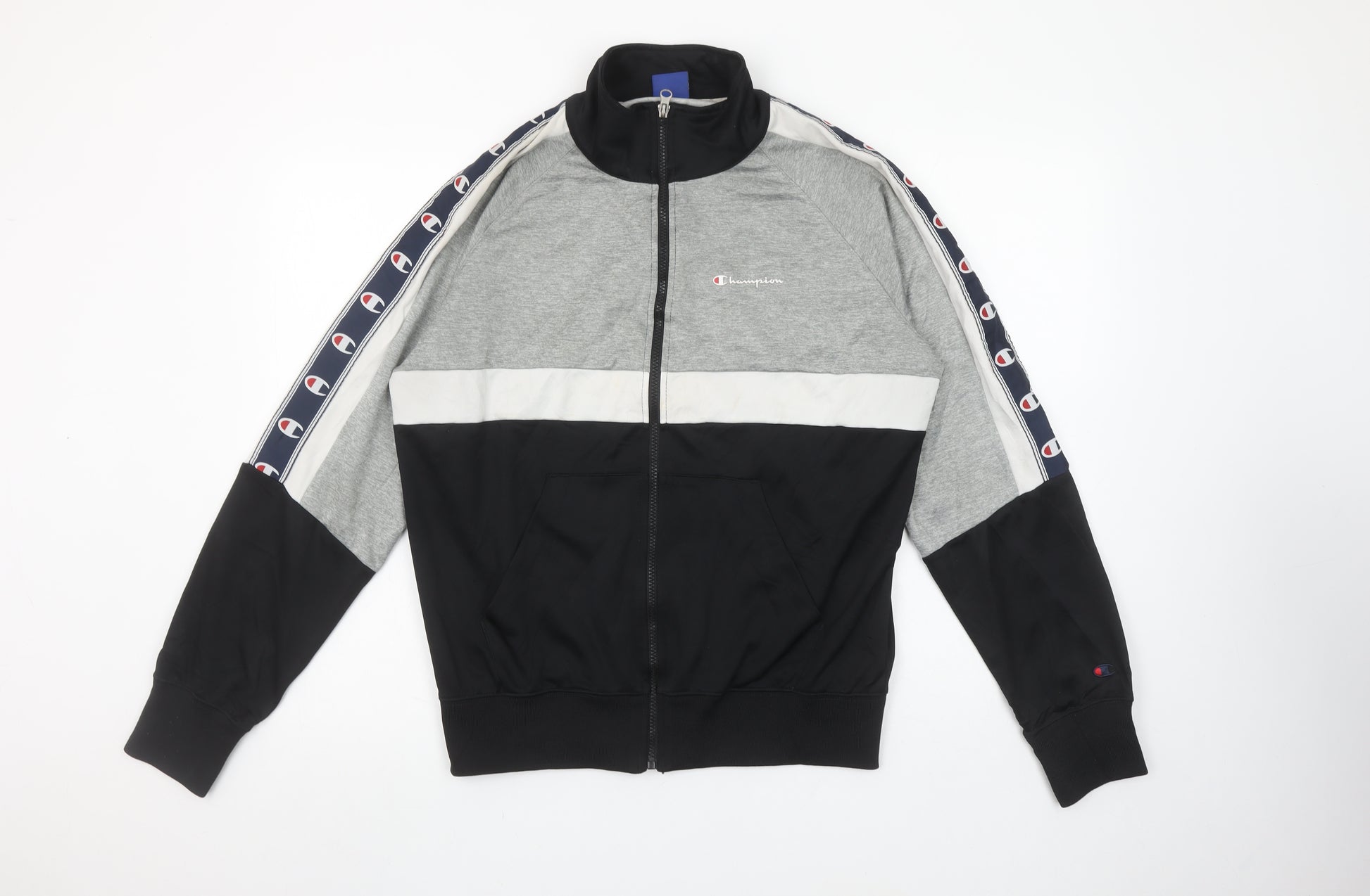Upgrade your casualwear with this Champion Men’s Full Zip Sweatshirt in black, grey and white. The striking colour-block design features a high neck, ribbed cuffs and hem, and the iconic Champion logo detailing along the sleeves. Crafted entirely from lightweight yet durable polyester jersey, this sweatshirt delivers excellent comfort and mobility for everyday wear or athletic performance. Designed with a relaxed regular fit, it includes front kangaroo-style pockets and a smooth zip closure that makes it ideal for layering through spring, autumn, and winter. The full zip design keeps it versatile, easy to wear over tees or under coats, while the breathable fabric ensures comfort whether you’re running errands, commuting, or working out. Despite some minor staining on the sleeves and front panel consistent with previous wear, the sweatshirt remains in good overall condition with plenty of life left. Perfect for the gym, casual streetwear, or hanging out, this sporty Champion track-top style sweatshirt captures a timeless athletic look with everyday practicality. Machine washable and built to maintain its shape and finish, it’s an affordable choice for anyone who values comfort paired with classic, sporty branding. Whether paired with joggers for training or jeans for a casual outfit, this versatile Champion sweatshirt offers a dependable combination of function and style in an instantly recognisable urban design.