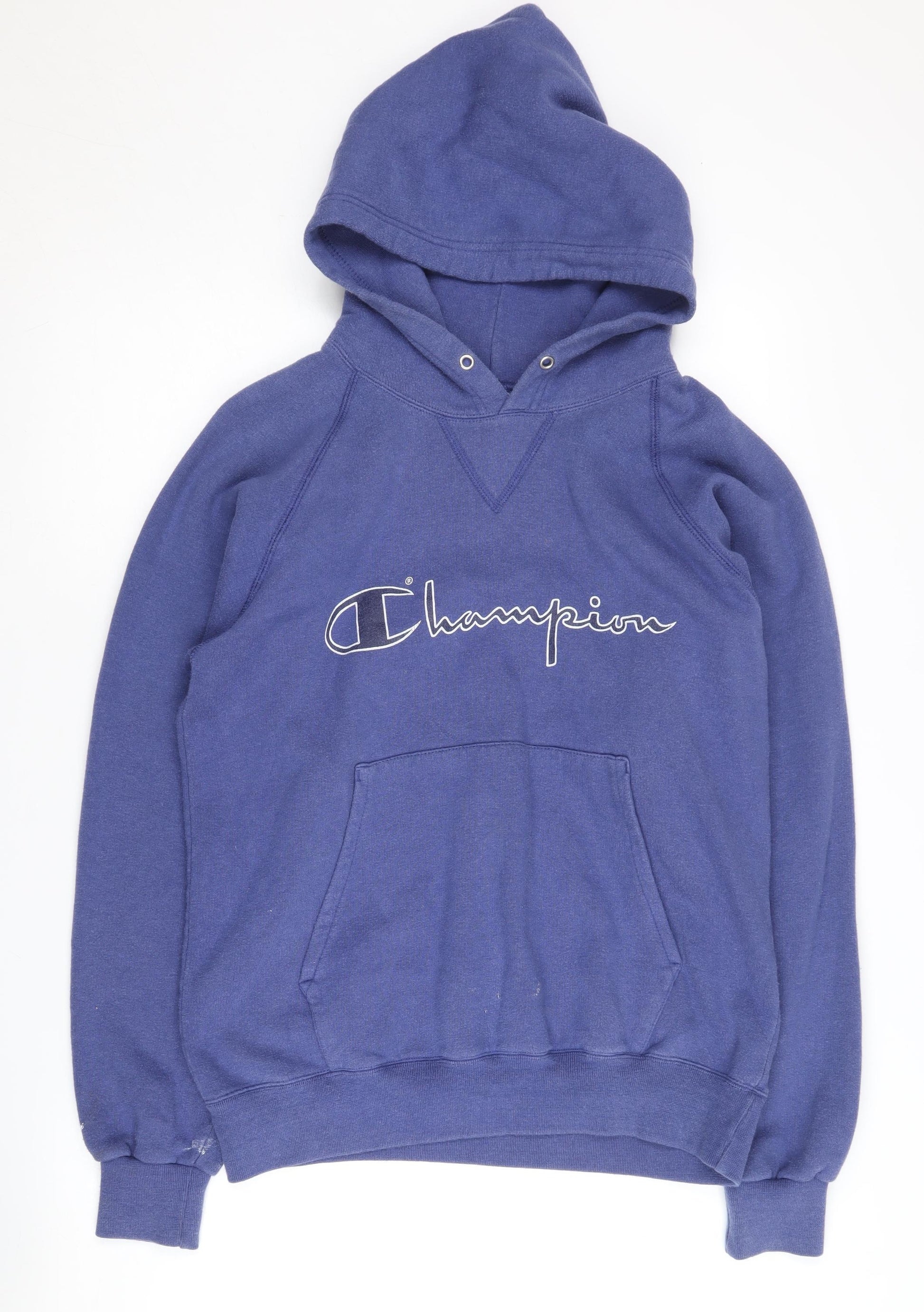 Elevate your casual wardrobe with this stylish and versatile Champion Men’s Pullover Hoodie. Crafted from a soft fleece fabric, this blue hoodie combines comfort and warmth, making it an ideal choice for the chilly months of autumn and winter. Featuring a regular fit, it provides ample comfort while maintaining a trendy, relaxed look.Designed in a classic pullover style with a hooded neckline, this hoodie ensures a snug fit for extra warmth. The front showcases the iconic Champion logo, adding a touch of sporty flair. With its practical drawstring hood and a convenient front pouch pocket, you can keep your hands cozy or carry small essentials easily.Made of a high-quality cotton and acrylic blend, this hoodie is both durable and machine washable, ensuring easy care and longevity. Its long sleeves and ribbed cuffs offer additional protection against the chill, perfect for any casual outing or lounging at home.Although in very good condition, please note a small stain on one of the cuffs, which does not detract from its overall appeal. Secure this versatile blue hoodie today and enjoy the blend of style and comfort that only Champion can deliver.