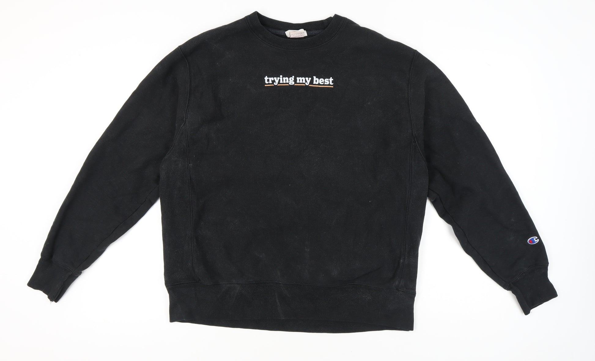 This Champion Reverse Weave men's sweatshirt in size Large is a timeless addition to any casual wardrobe. Designed in a versatile black colour, it features a bold embroidered 'trying my best' slogan across the chest that makes a confident style statement. Crafted from a premium cotton and polyester blend, the fabric ensures both comfort and durability, making it ideal for regular wear. The pullover style with a classic crew neck, long sleeves, and ribbed cuffs delivers that signature sporty look Champion is renowned for. Constructed with heavyweight fleece fabric, this sweatshirt is perfect for cooler weather while still being breathable enough for transitional seasons like spring and autumn. Its regular fit offers a relaxed but stylish silhouette, making it suitable for everyday wear, whether lounging at home or heading out and about. The small Champion logo embroidered on the sleeve adds an unmistakable branded touch. The sweatshirt’s minimalist design is combined with a thematic statement that appeals to fans of university-style, sporty apparel, or just those who love motivational fashion. A versatile piece for layering, it pairs well with joggers, jeans, or shorts, making it highly adaptable across different occasions. Though in very good pre-loved condition, this sweatshirt shows some light fading and slight wear on the cuffs, consistent with normal use. Nonetheless, it remains an excellent quality garment with plenty of life left in it. Machine washable for easy care, this piece is both practical and stylish. A brilliant option for men seeking a wardrobe staple that combines Champion’s iconic sports-inspired design with a touch of individuality. Whether you’re wearing it for training, casual wear, or out on a weekend, this Champion sweatshirt will keep you comfortable and on-trend throughout the seasons.