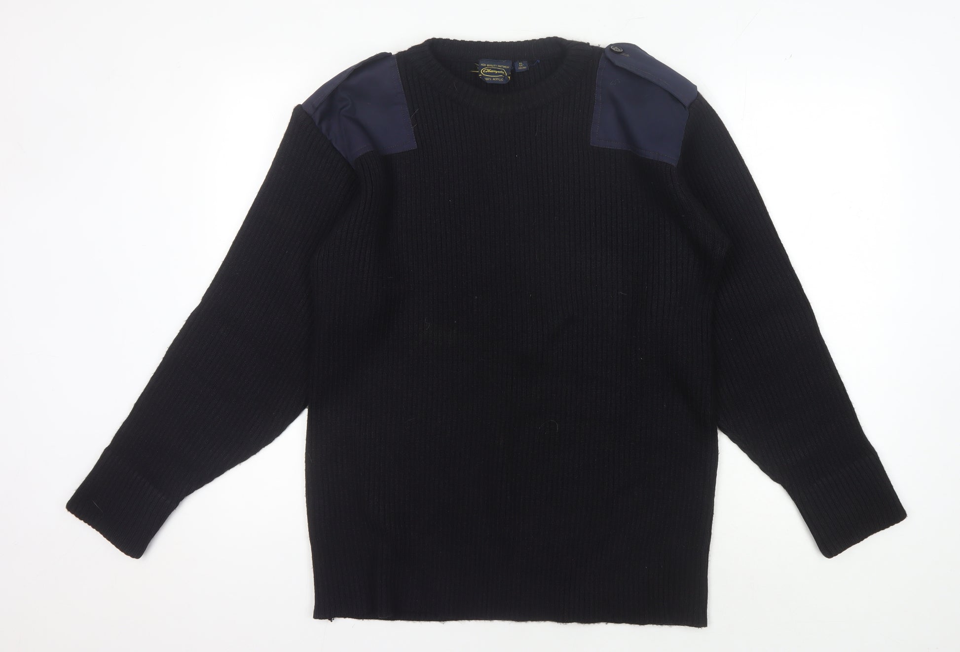 Elevate your winter wardrobe with this classic Champion Men's Black Pullover Sweater, perfect for those chilly autumn and winter days. Crafted from 100% high-quality acrylic, it offers a heavyweight design that ensures warmth and protection against the cold. Featuring a timeless crew neck and long sleeves, this jumper is tailored to offer a comfortable regular fit, ideal for casual wear. Its simple yet stylish design includes button accents on the shoulders, adding a unique touch to this otherwise plain black piece. Whether you're out for a leisurely walk or enjoying a casual outing with friends, this sweater will provide both style and functionality. The durable knit fabric ensures longevity while maintaining a soft and cosy feel. Don't miss out on this excellent condition jumper, a must-have staple for any fashion-conscious man's wardrobe.