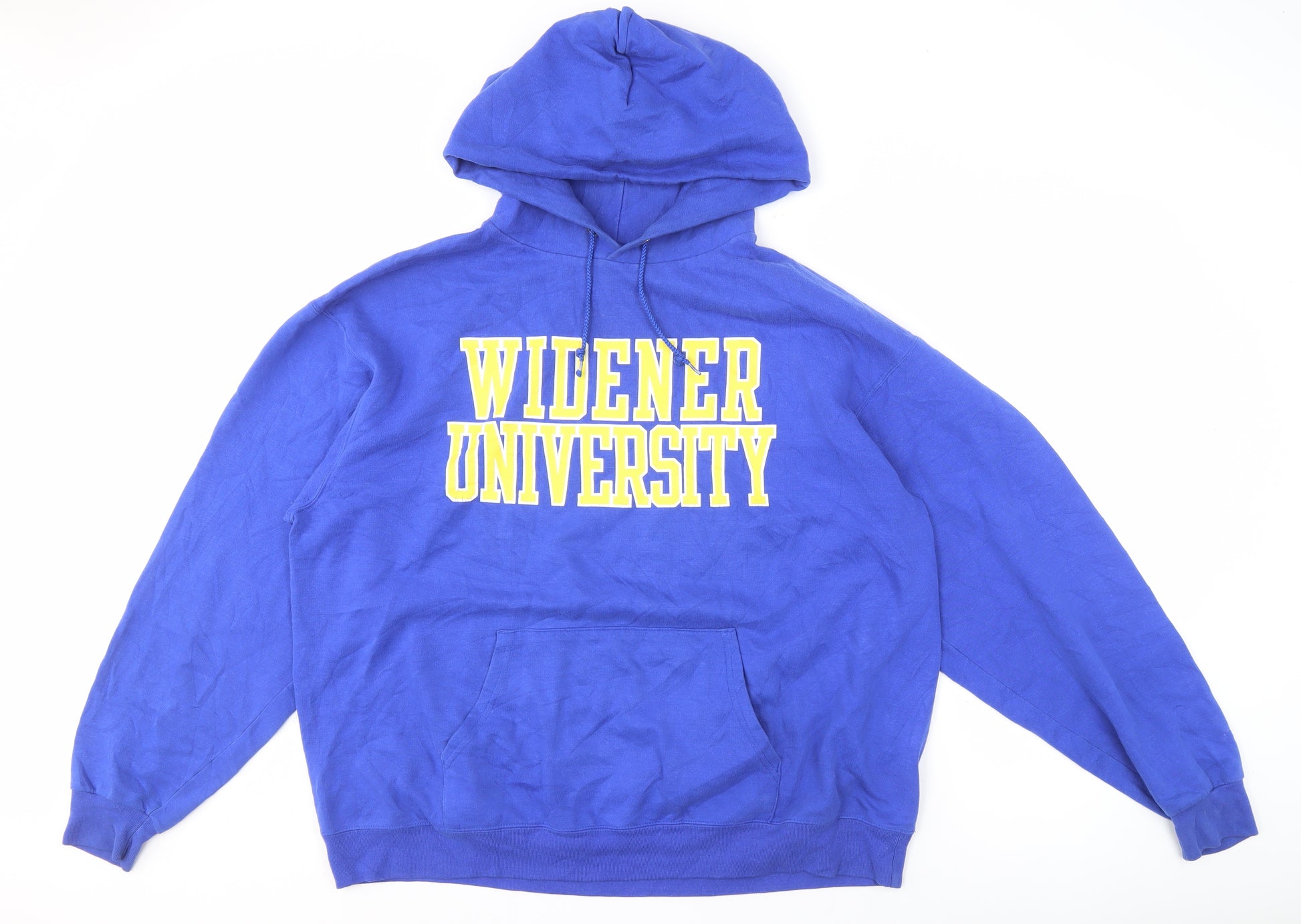 Stay comfortable and stylish with this Champion Men's Blue Pullover Hoodie in size XL. Featuring a classic design, this hoodie is perfect for those casual days out or relaxing indoors. The vibrant blue colour adds a touch of boldness, while the Widener University logo provides a unique and sporty accent. Crafted from a soft fleece fabric, it ensures warmth and comfort during autumn and winter. The hoodie includes practical features such as a drawstring hood for adjustable comfort and a front pocket for added convenience. The regular fit and crew neckline offer timeless style suitable for many occasions. This garment combines Cotton and Polyester for durability and a pleasant feel. The material is machine washable, making it easy to care for. Ideal for everyday wear, this hoodie makes a versatile addition to any wardrobe. Despite being pre-owned, it's in excellent condition with only light wear, ensuring you enjoy lasting quality and style.