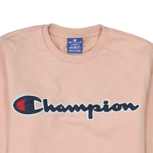 This Champion women's pullover sweatshirt offers a timeless combination of sporty style and everyday comfort. Crafted from a soft cotton blend, it delivers a cosy, breathable feel perfect for layering or wearing on its own. The sweatshirt features a classic crew neckline, long sleeves, and ribbed hem and cuffs for a snug fit that keeps its shape. Presented in a soft blush pink tone, the piece showcases the signature Champion logo in bold applique embroidery across the chest and a smaller embroidered emblem on the sleeve. Designed for casual wear, it pairs effortlessly with jeans, joggers, or leggings, making it suitable for any laid-back outing or relaxed weekend. The medium-weight fabric ensures year-round wearability, ideal for springtime warmth or layering in autumn and winter. The Champion XS label confirms an authentic piece made in Cambodia. Its simple yet statement aesthetic, combined with premium craftsmanship, ensures durability and a stylish look that never dates. In excellent pre-owned condition, this sweatshirt displays minimal signs of wear with no visible marks or flaws, offering great value for buyers seeking sporty wardrobe staples from a trusted heritage brand. Whether for a gym session, a casual streetwear outfit, or a relaxed day at home, this Champion pink pullover sweatshirt will quickly become a go-to essential for comfort and effortless style.