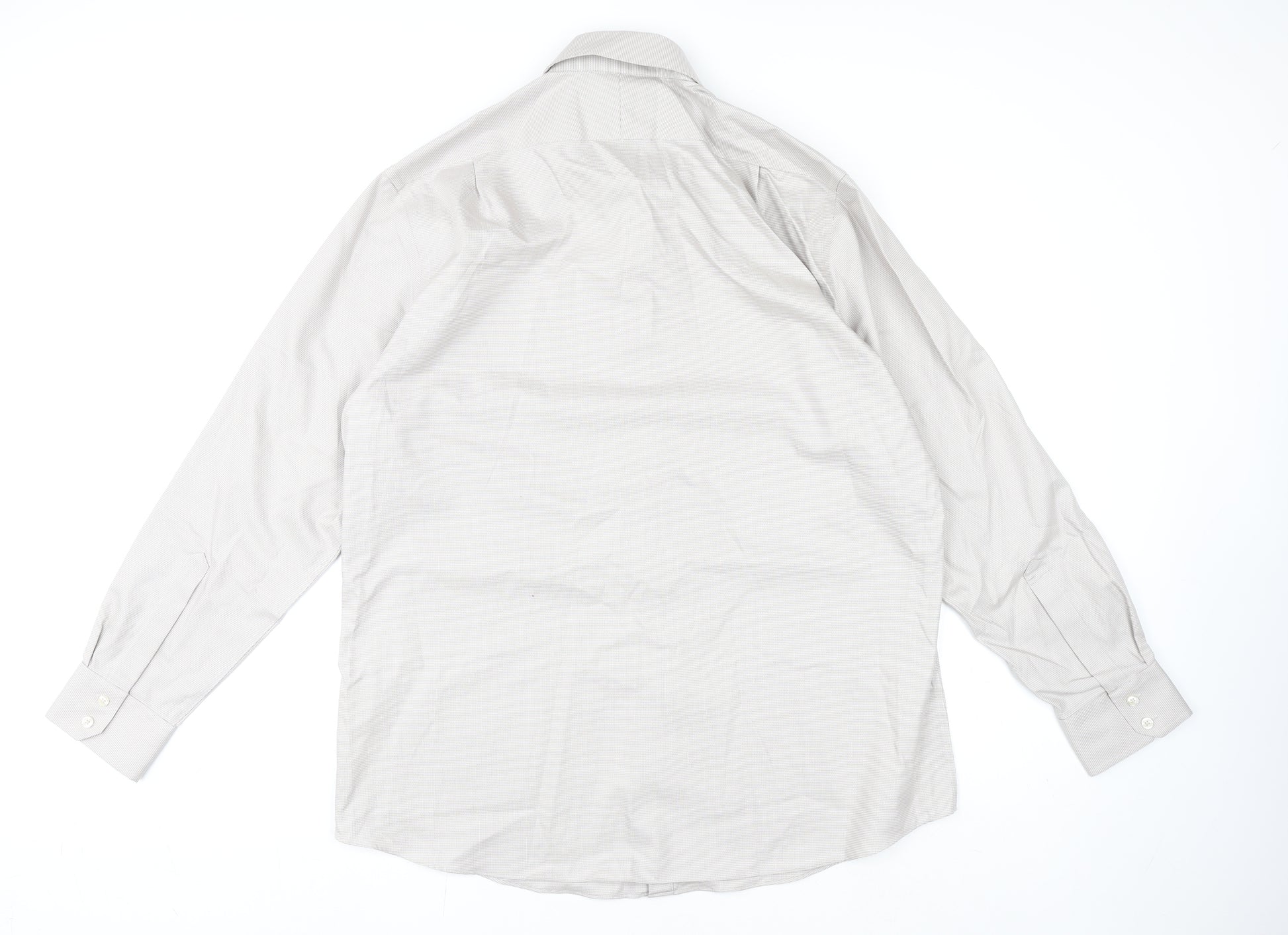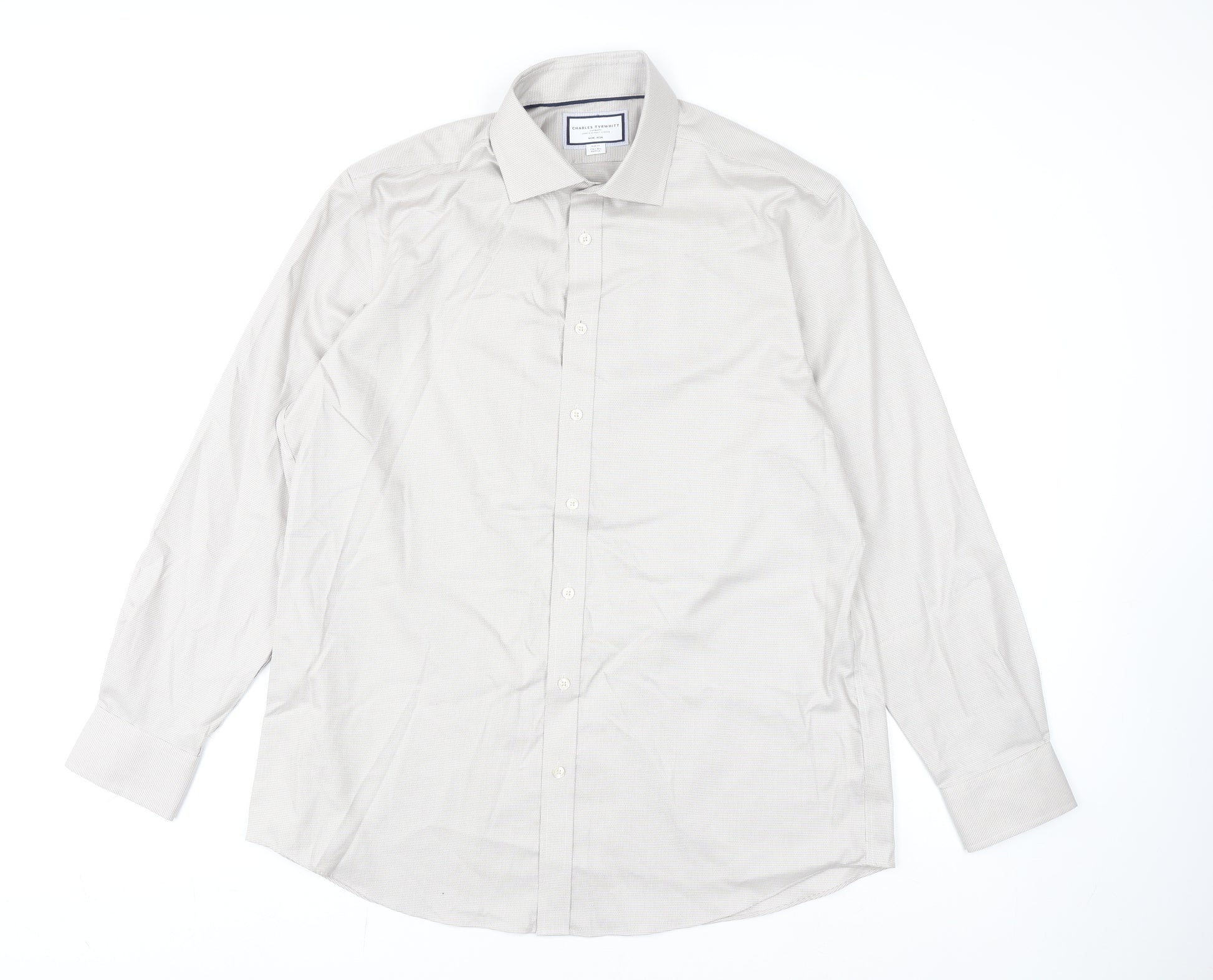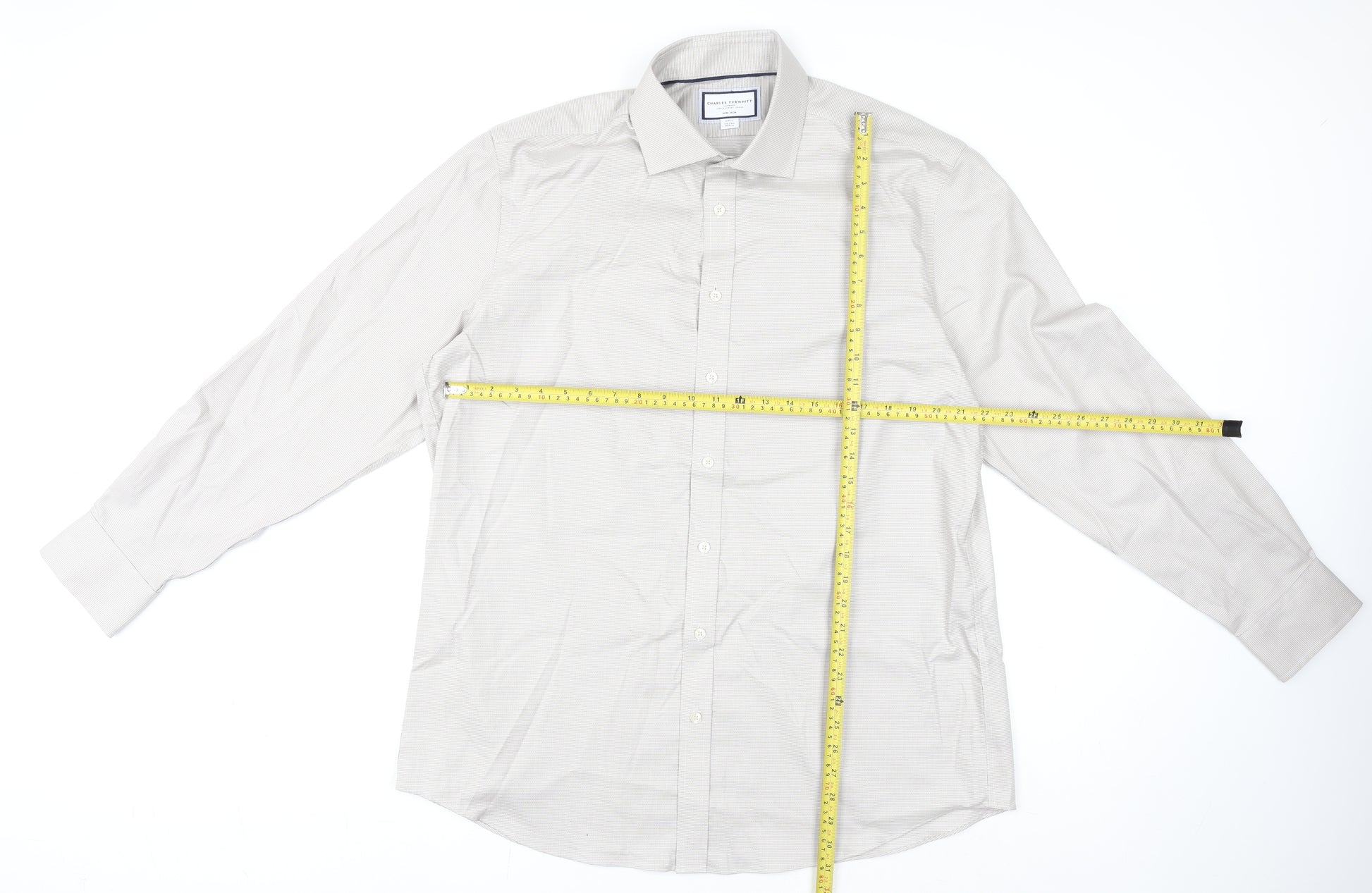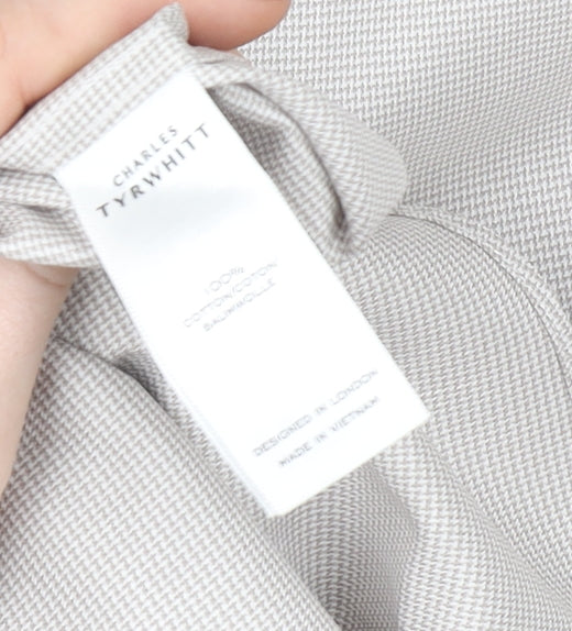 Elevate your wardrobe with this refined Charles Tyrwhitt men's dress shirt, tailored for the modern gentleman who values comfort, style, and sophistication. Crafted from 100% premium cotton, this non-iron shirt combines crisp presentation with effortless maintenance, making it ideal for business, formal events, or daily office wear. The breathable natural fabric ensures all-day comfort, while the slim fit silhouette offers a flattering and contemporary profile. The subtle beige houndstooth weave adds understated texture and elegance, lending versatility that transitions seamlessly from boardroom meetings to evening engagements. Designed with a classic collared neckline and a point collar style, this shirt pairs beautifully with suits, blazers, or smart trousers. The long sleeves feature barrel cuffs for a traditional finish, while the button front closure complements its refined design. Engineered with non-iron technology, this shirt maintains a smooth appearance straight from the hanger, minimising effort while enhancing your polished look. Practical, durable, and timelessly stylish, this piece embodies Charles Tyrwhitt’s commitment to exceptional craftsmanship and quality. Machine washable for convenience, it’s perfectly suited for year-round wear, ensuring you stay sharp and comfortable on any occasion. In excellent pre-owned condition, showing only light creasing from storage, this shirt is ready to wear and impress. A perfect addition to any discerning gentleman's collection, offering a balance of contemporary style and traditional tailoring excellence. Make an impression with this versatile Charles Tyrwhitt beige slim fit shirt — an essential for the confident and well-dressed man.
