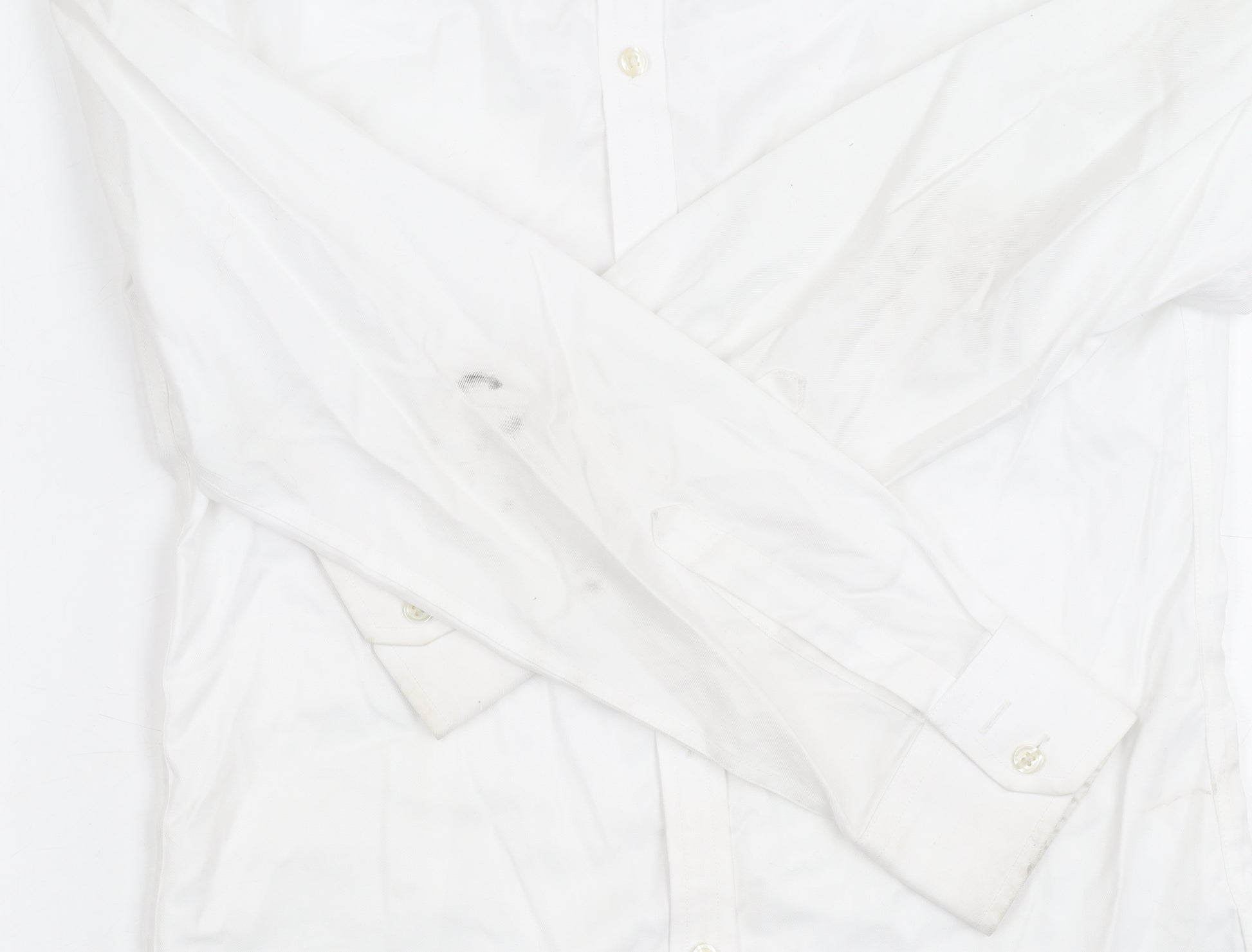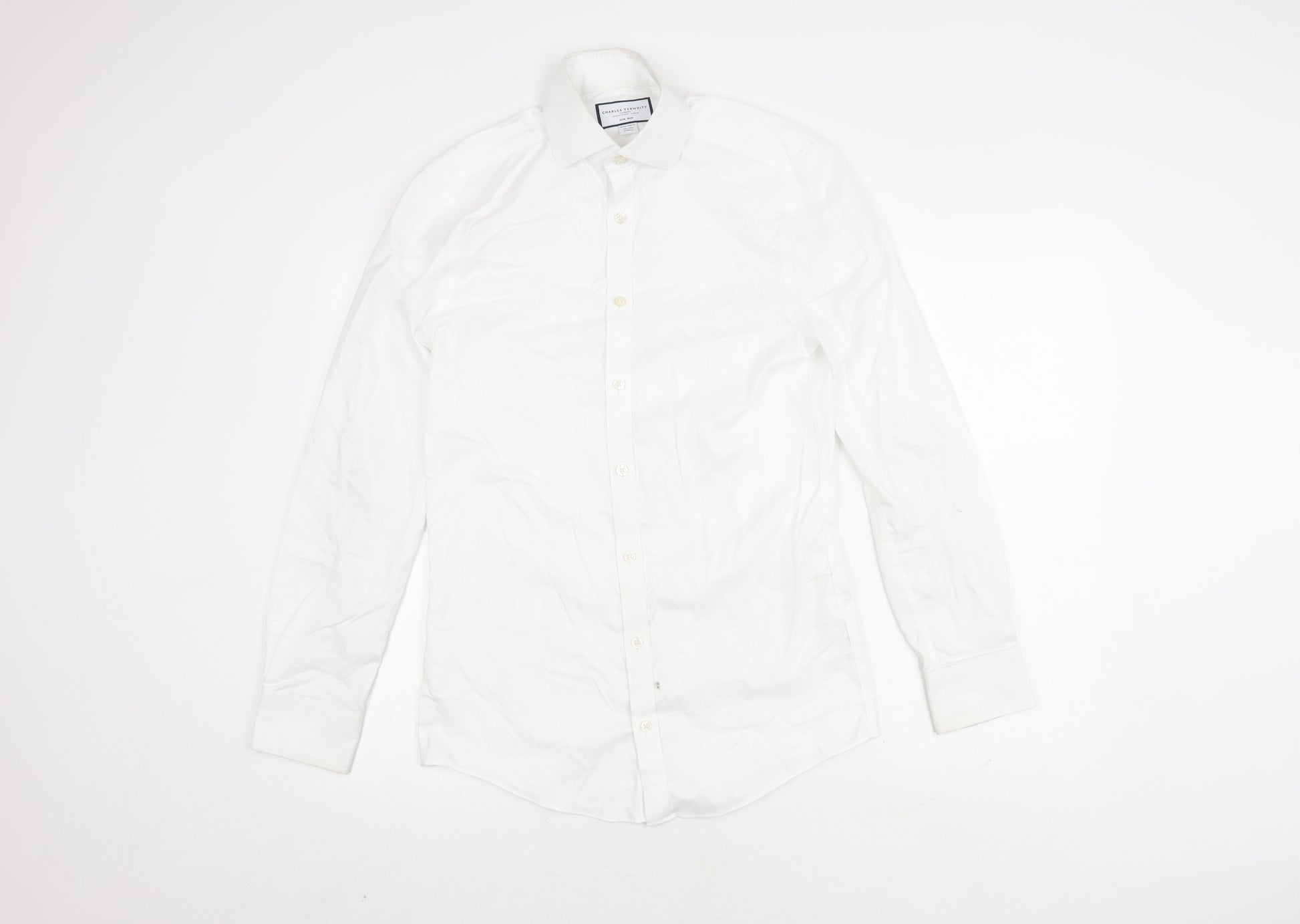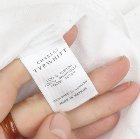 Elevate your wardrobe with this Charles Tyrwhitt men's shirt, renowned for its refined look and extra-slim fit. Perfectly tailored to offer a sleek silhouette, this elegant piece is crafted from 100% pure cotton, ensuring comfort and durability with every wear. The pristine white shade combines seamlessly with any ensemble, whether for business or casual occasions.This non-iron button-up shirt simplifies your morning routine, saving you precious time. The point collar and long sleeves add a classic touch, making it ideal for all seasons. Its solid pattern allows for versatile styling with various outfits, making it a staple piece for any fashion-forward man. Although it bears slight staining on the sleeve, it remains in good condition and enhances any gentleman's attire.Machine washable for easy maintenance, this Charles Tyrwhitt shirt promises unmatched practicality and style, ensuring you look polished and put together on every occasion. Lined with button accents, it offers a sophisticated appeal, perfect for those seeking a timeless, versatile addition to their collection.
