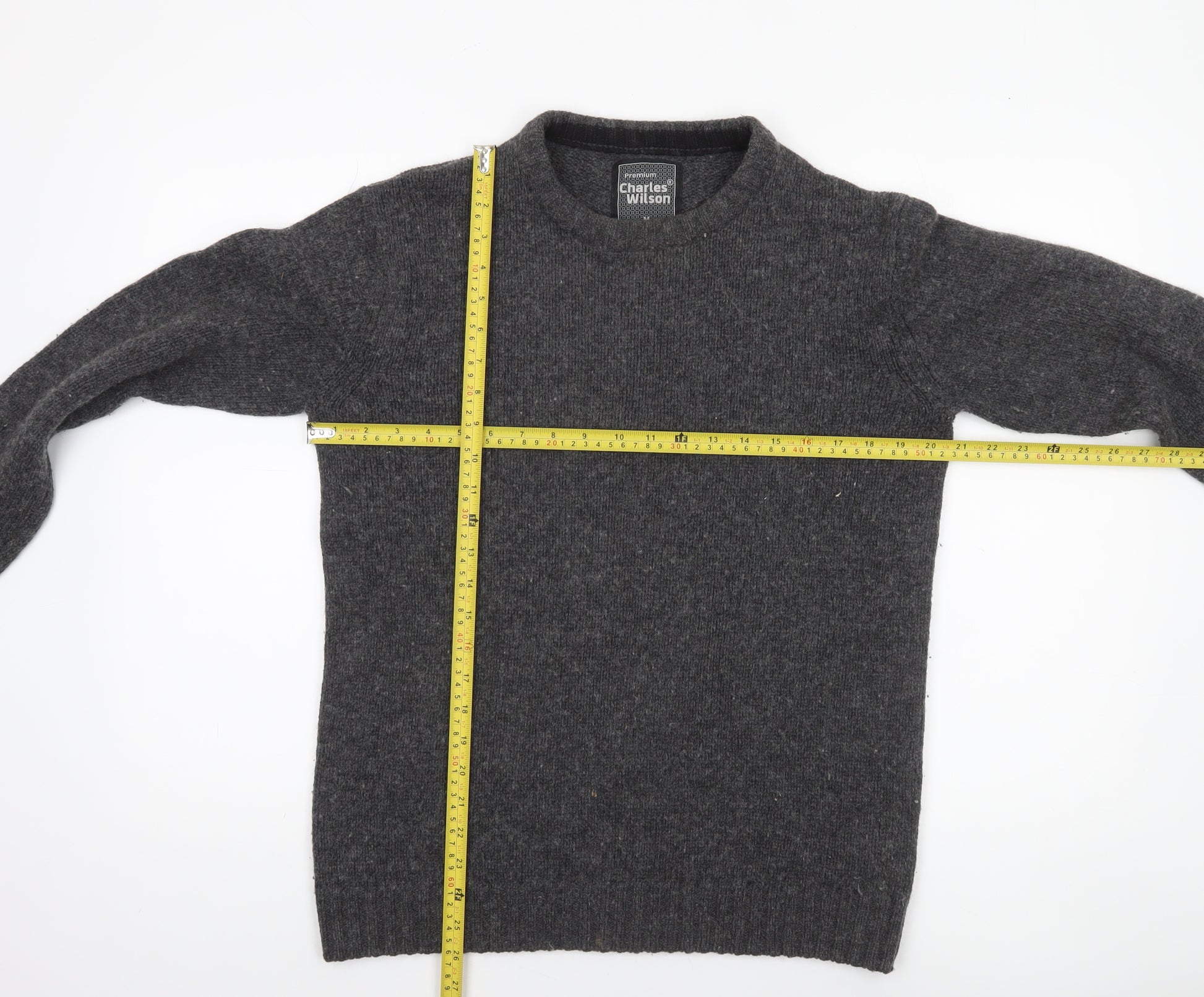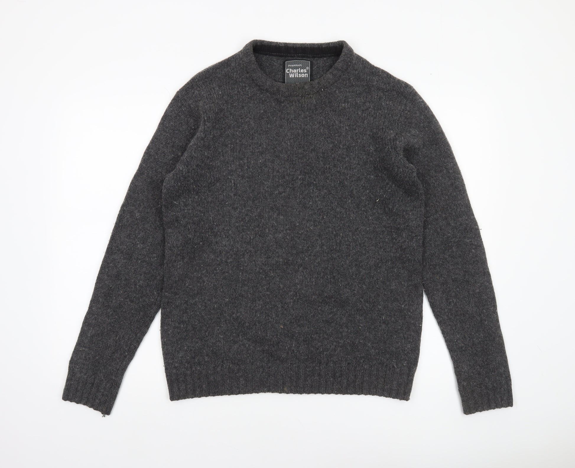 This Charles Wilson men's grey pullover jumper offers a perfect combination of warmth, comfort, and timeless style. Crafted from a quality blend of 50% cotton and 50% wool, this knitwear piece provides an excellent balance between breathability and insulation, making it ideal for both autumn and winter wear. The crew neckline and classic slim fit ensure a flattering, versatile silhouette that works effortlessly for casual and everyday outfits. The simple, tight-knit texture adds structure and durability, while the absence of loud patterns highlights its understated, refined style.Designed with long sleeves, ribbed hem, and cuffs, this jumper provides a snug, comfortable fit that holds its shape well. The soft wool fibres offer a cosy feel, while the cotton keeps it breathable for all-season versatility. Its plain grey hue is easy to coordinate with chinos, jeans, or trousers, lending itself to smart-casual styling ideal for coffee outings, relaxed office days, or weekend layering.Although gently worn, this item remains in very good condition with only light bobbling visible from minimal use, maintaining the quality and integrity expected from the Charles Wilson brand. It is machine washable for easy care but should not be tumble dried to preserve its fabric longevity.A versatile must-have in any man's wardrobe, this Charles Wilson wool-cotton jumper combines practicality with modern minimalism. Its neutral tone and simple lines make it suitable for layering under jackets or coats and pairing with scarves for a smart, effortless look throughout the cooler months. Elegant, comfortable, and crafted for easy everyday wear, this jumper exemplifies subtle sophistication at an affordable price point.