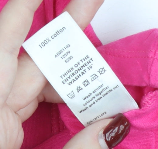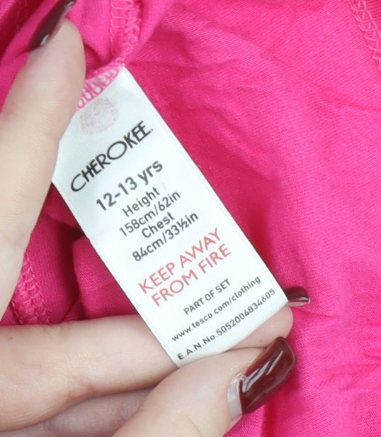 This Cherokee Girls Pink Graphic T-Shirt offers a fun and playful design that is perfect for everyday wear. Made from 100% cotton, it ensures softness and breathability, making it comfortable to wear throughout the day. Designed for girls aged 12–13 years (height 158 cm, chest 84 cm), it features a relaxed yet flattering regular fit with a scoop neck that provides ease of movement. The short sleeves make it especially suitable for spring and summer, keeping your child cool and comfortable in warmer conditions.The standout feature of this T-shirt is its eye-catching graphic print, showcasing a playful black cat design adorned with a crown alongside whimsical bows and heart motifs in contrasting black details. The bold pink base adds a vibrant pop of colour that is sure to appeal to young fashion enthusiasts. With a pullover closure, dressing is made quick and simple, while the lightweight jersey fabric ensures a soft touch and durability for regular wear. This item was originally included as part of a clothing set but works perfectly as a standalone piece.Machine washable and easy to care for, this garment is practical for everyday school wear, casual outings, or fun leisure activities. The T-shirt embodies a cheerful aesthetic with its animal theme, making it a charming addition to any young girl’s wardrobe. The breathable 100% cotton fabric guarantees comfort, while the high-quality construction ensures long-lasting use.Condition is very good, showing gentle pre-loved use but with no stains, tears, or heavy wear. Some light creasing is visible from storage. Though it no longer includes original sales tags, it remains a stylish and practical choice. Parents will appreciate not only its durability and easy care but also its versatile style that can be paired effortlessly with jeans, shorts, or skirts.Whether for school days, relaxed weekends, or casual playdates, this Cherokee T-shirt is a fun and fashionable staple. Its bright colour, comfortable fabric, and playful cat motif make it a must-have for any girl who loves a mix of comfort and style.