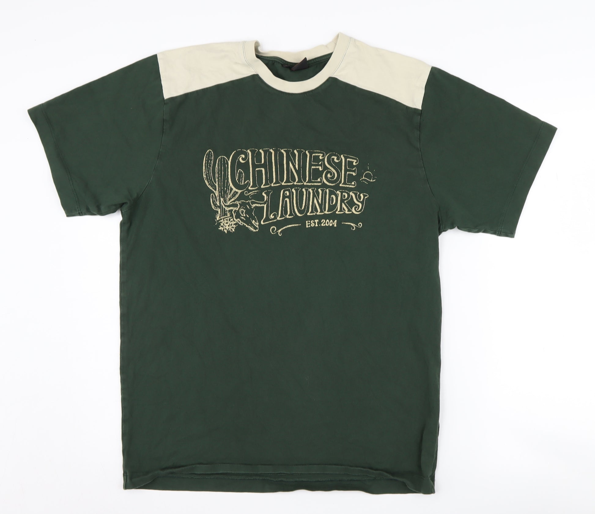 Discover vintage flair with this 'Chinese Laundry' T-shirt, crafted from 100% lightweight cotton for ultimate comfort. Ideal for everyday wear, the shirt features a unique graphic print and a classic crew neck design. The subtle blend of green tones adds an edge while maintaining a versatile look. Perfect for casual outings, this short-sleeve tee offers breathability and style in equal measure. With its excellent condition, it promises durability and long-lasting wear. Pair it with jeans or shorts for a relaxed, trendy outfit.
