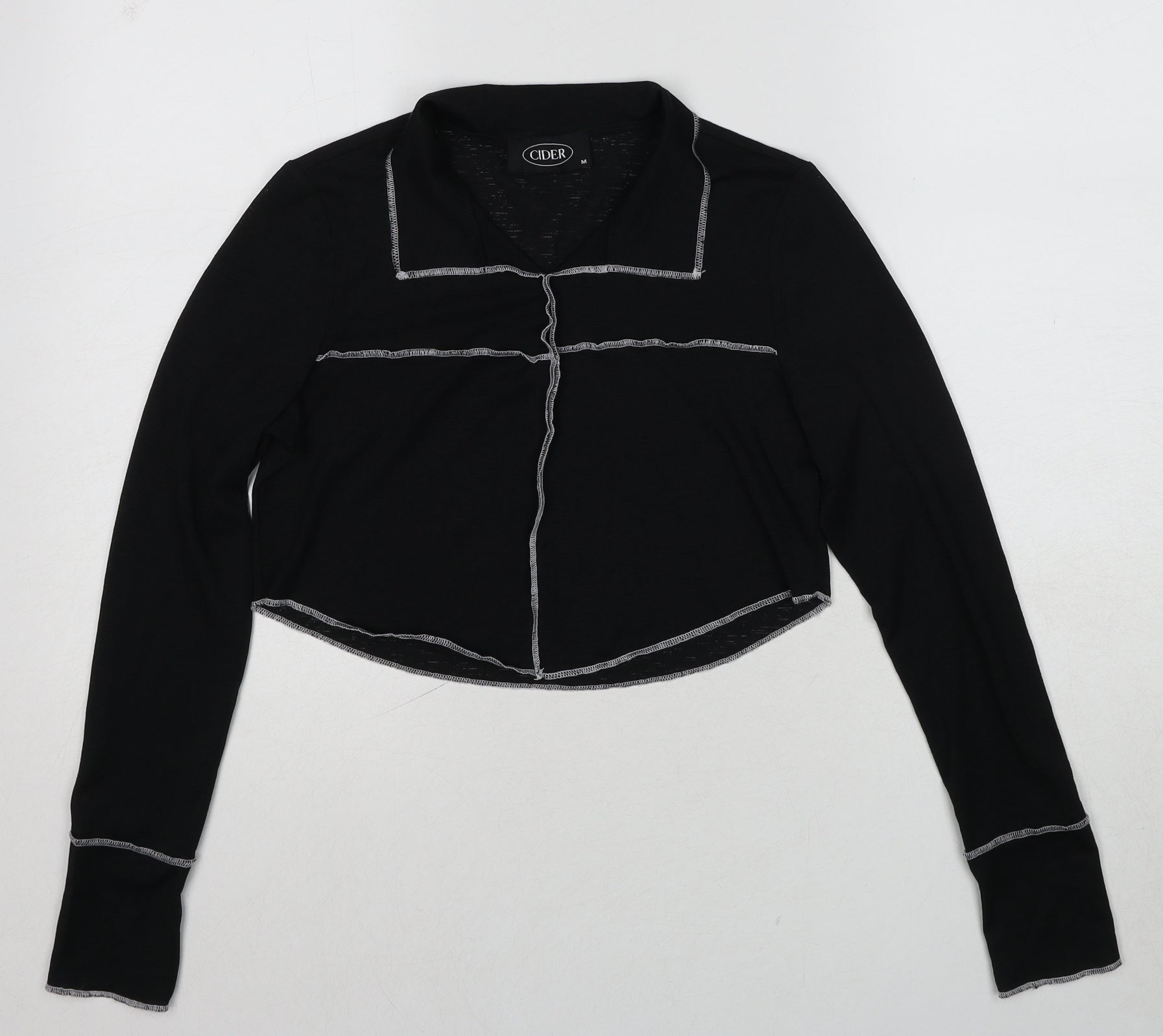 Womens Black Polyester Cropped Blouse Size M Collared - Contrast Stitching