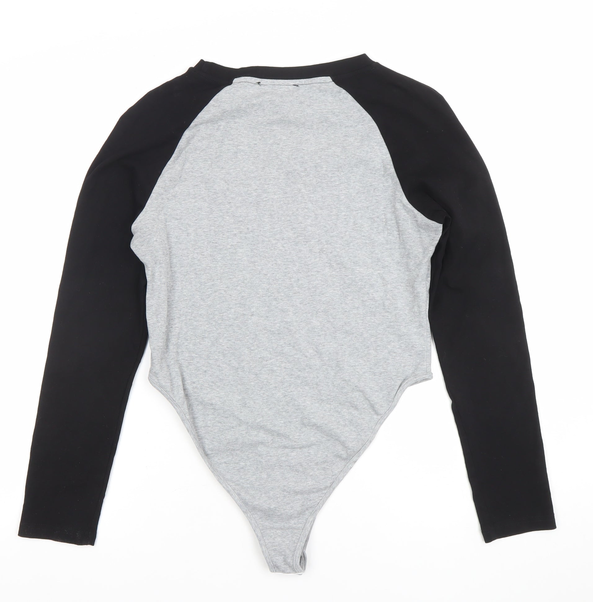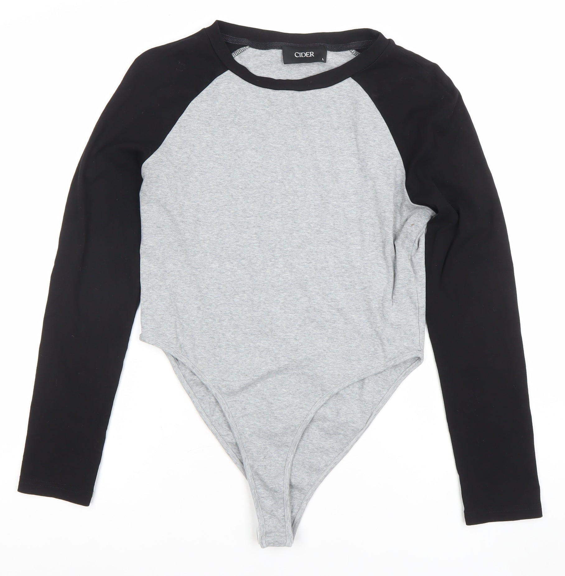 Elevate your everyday wardrobe with this Cider women's long sleeve bodysuit in a chic colourblock design. The sleek grey body and contrasting black sleeves create a modern and versatile look suitable for layering or wearing on its own. Crafted from soft jersey fabric composed of cotton and elastane, this piece offers a comfortable stretch fit that moves with you throughout the day. The crew neckline and raglan sleeves add a casual, sporty touch, making it easy to pair with jeans, skirts, or trousers for a stylish, laid-back outfit. The one-piece bodysuit design ensures a smooth, tucked-in finish without constant readjustment, while the snap closure provides added convenience. Perfect for layering in autumn and winter or wearing alone during cooler spring months, this piece balances comfort with contemporary style. Ideal for casual wear, lounging, or pairing with high-waisted trousers for an effortless everyday outfit, this Cider bodysuit combines practicality and fashion seamlessly. In excellent pre-owned condition with light signs of wear but no noted flaws, it represents great value and timeless appeal for your wardrobe. Whether you’re updating your casual basics or searching for a versatile layering piece, this bodysuit is an easy addition that flatters and fits beautifully while maintaining a streamlined aesthetic. Available in size L, it provides a regular fit that flatters different body shapes and offers comfort without compromising on style.