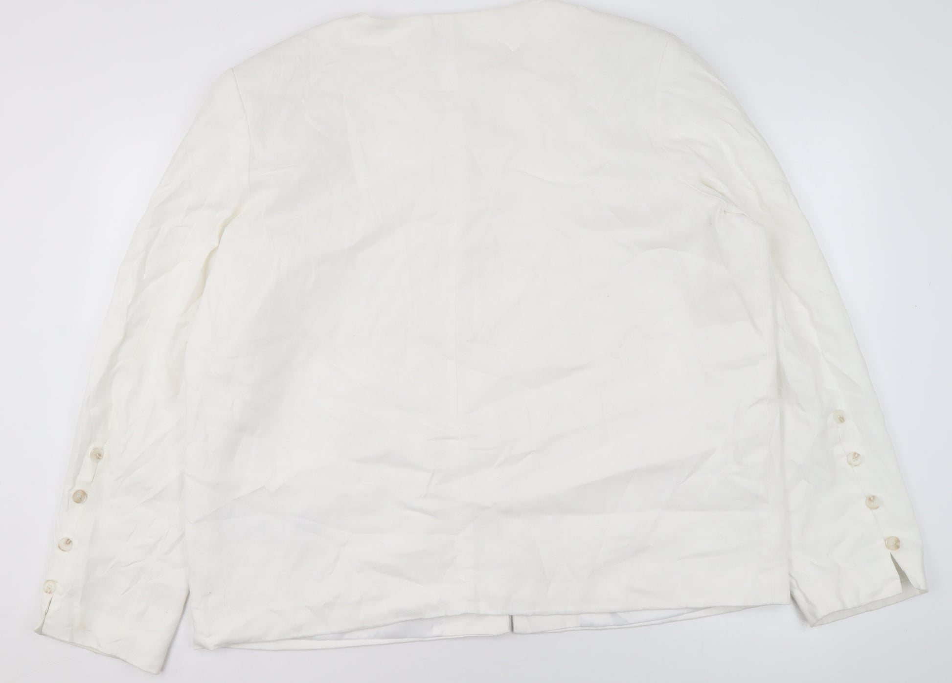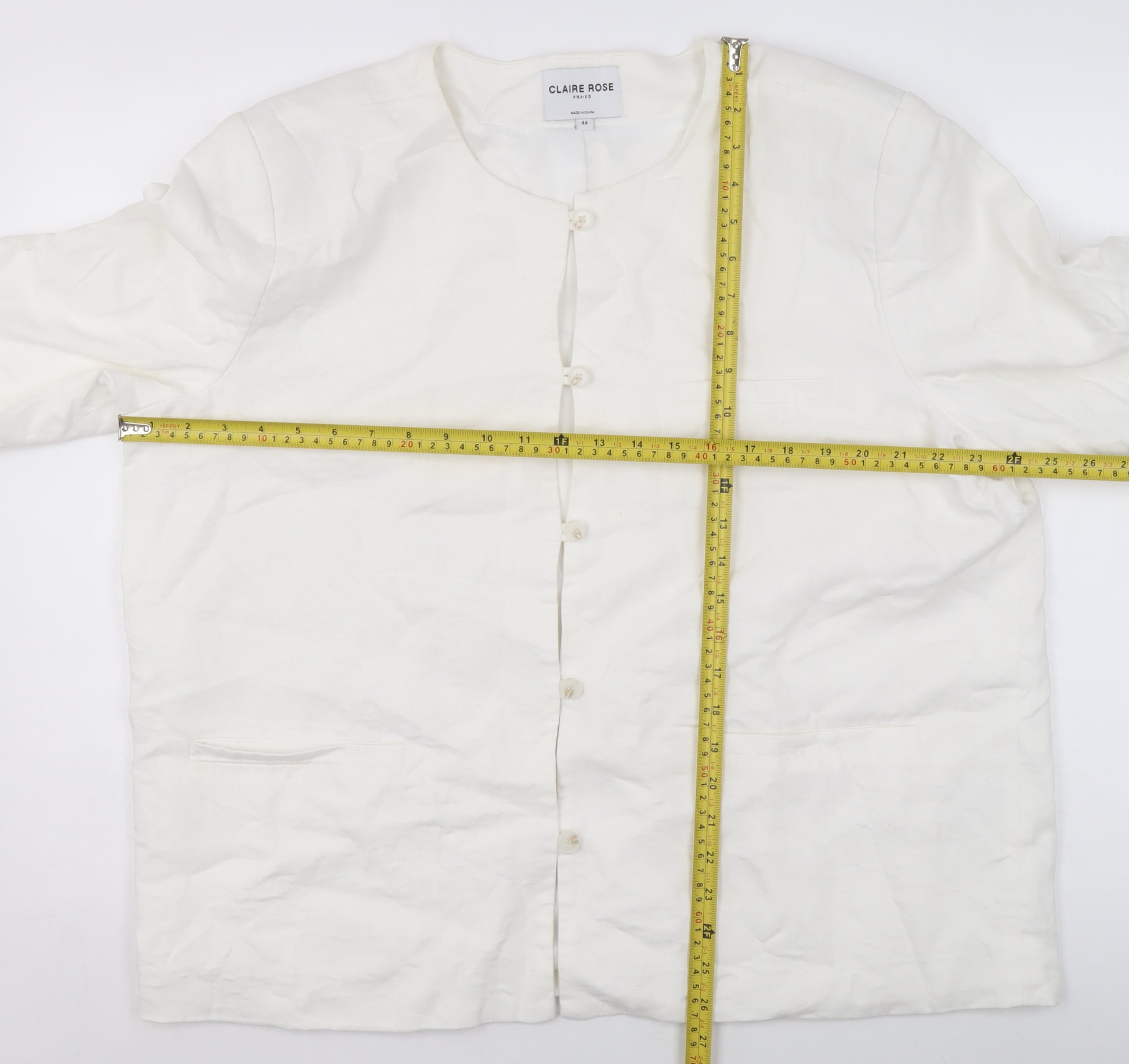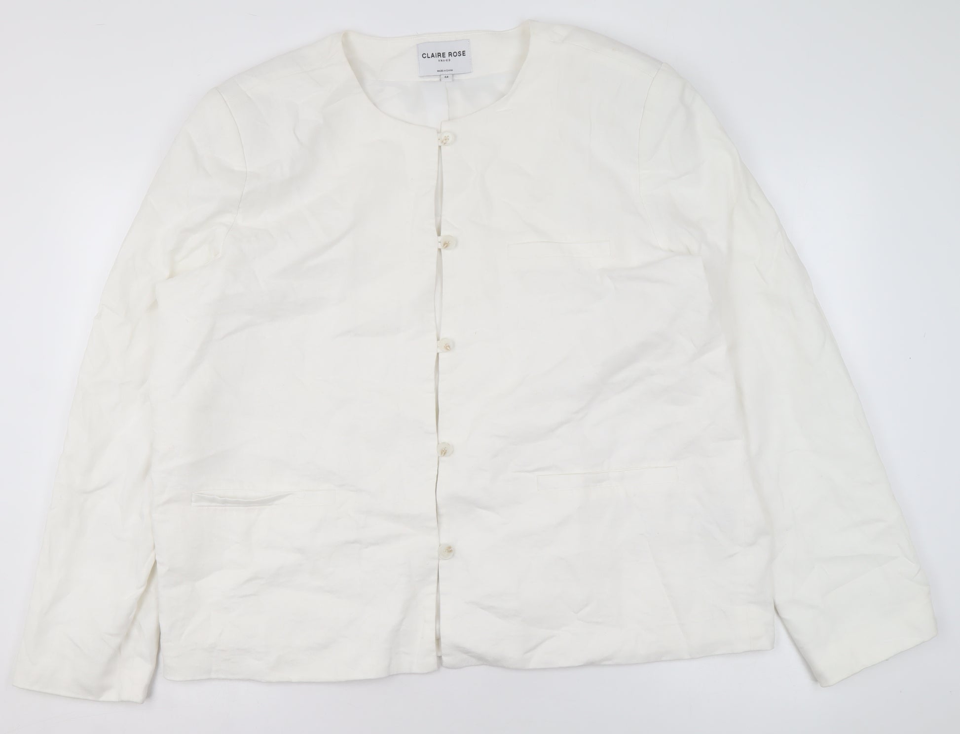 Elevate your everyday wardrobe with this effortlessly sophisticated Claire Rose Women’s Blazer. Rendered in a fresh white tone, this jacket offers a clean and contemporary aesthetic perfect for both smart casual and office wear. Crafted from a breathable woven fabric comprising 55% linen and 45% cotton, it combines the lightweight comfort of linen with the easy-care practicality of cotton. The regular fit flatters the silhouette, while the long sleeves and single-breasted front lined with five buttons give a polished touch suitable for both business and off-duty ensembles. The fully lined interior, with a soft polyester finish, ensures smooth wear and a neatly tailored appearance. Subtle four-button detailing on the cuffs and two discreet front pockets add a refined touch of practicality without compromising style. Ideal for the spring and summer seasons, this blazer transitions seamlessly from day to night, whether paired with trousers for a professional look or jeans for a more relaxed vibe. The pure white hue makes it a versatile layering piece that harmonises beautifully with a wide range of wardrobe colours and textures. In excellent pre-loved condition with only minor creasing consistent with gentle wear, this blazer maintains its structural integrity and chic charm. Designed for women who appreciate timeless elegance and effortless dressing, it’s a wardrobe essential that never goes out of style. Whether you’re searching for the perfect piece to complete a lightweight suit or a stylish jacket for warm-weather layering, this Claire Rose blazer offers a modern twist on classic tailoring. Add an air of understated sophistication to your wardrobe with this beautifully balanced piece — ideal for both workwear and casual outings, ensuring a look that’s sleek, versatile, and always on trend.
