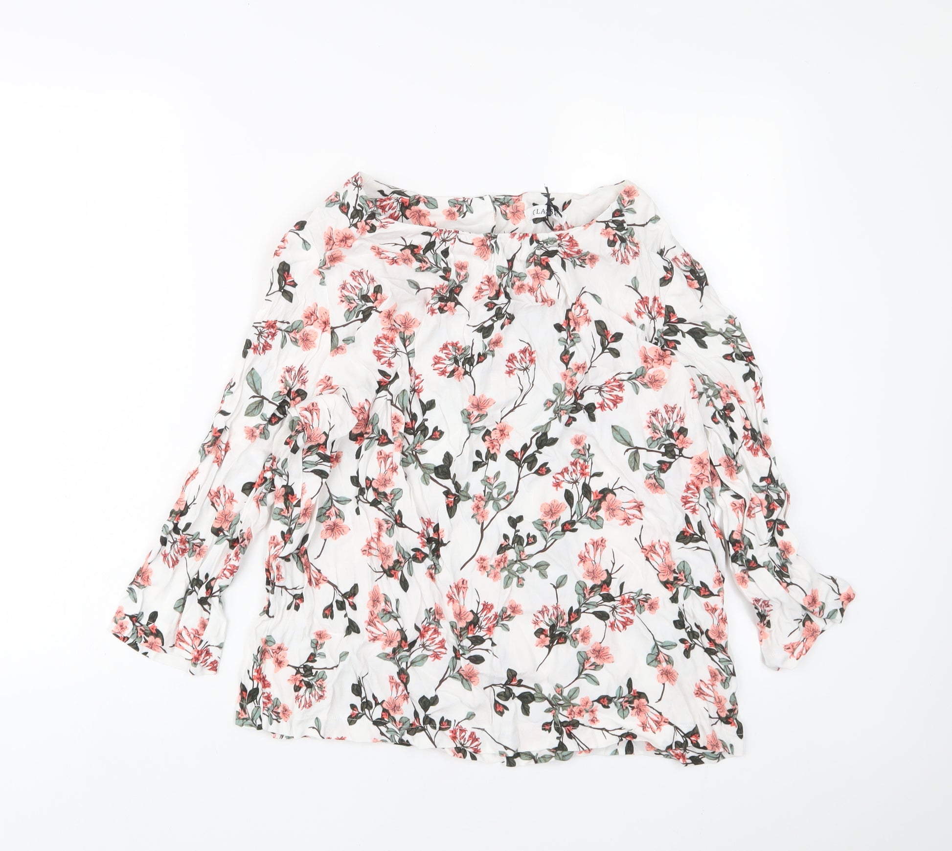 Womens White Floral Viscose Basic Blouse Size 14 Crew Neck