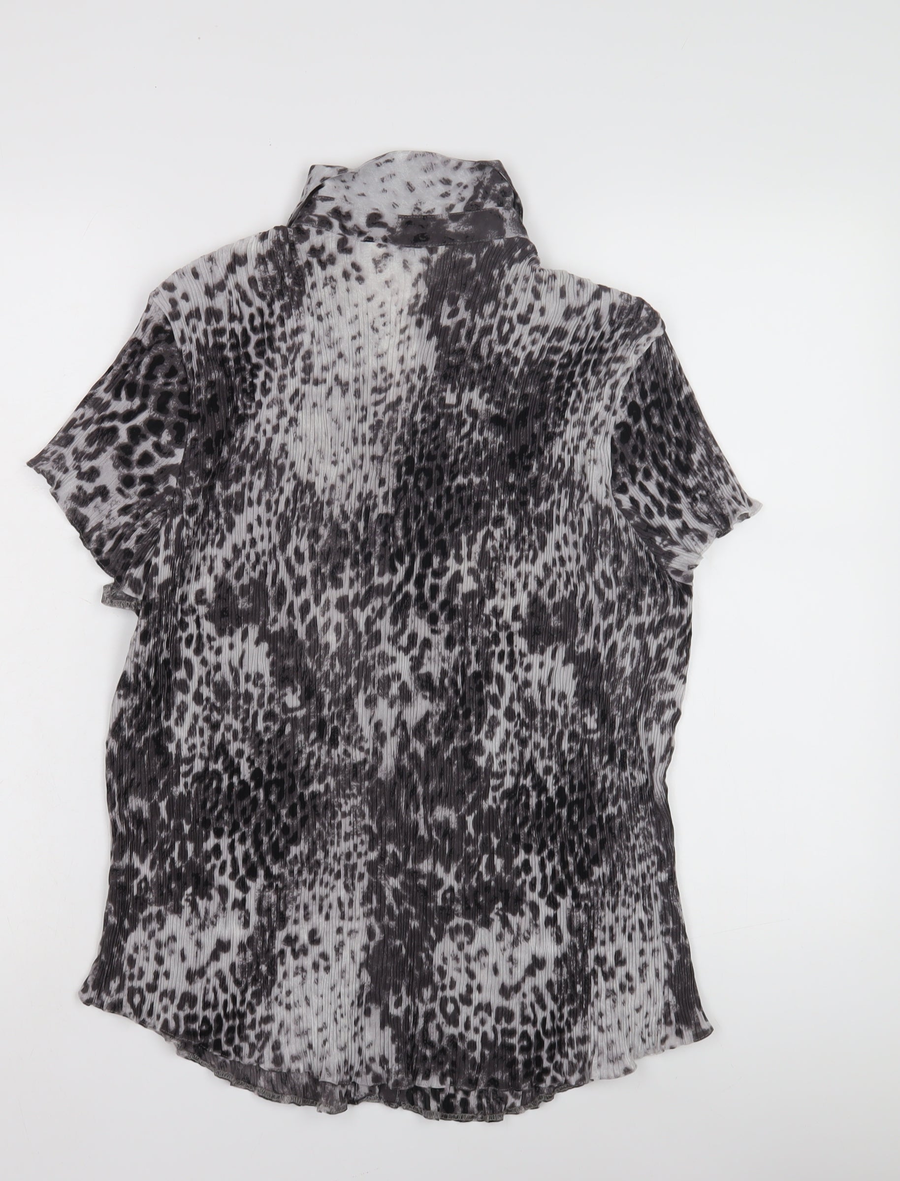 Elevate your wardrobe with this stylish Classics women's shirt, featuring a striking grey animal print design that exudes sophistication. Crafted from high-quality polyester, this top ensures both comfort and durability, making it a versatile addition to your collection. With its short sleeve design and woven fabric, it offers a relaxed yet chic look perfect for various occasions, from casual outings to more upscale gatherings. The collared neckline and button closure add a touch of classic elegance, while the regular size ensures a flattering fit. In excellent condition, this shirt showcases no visible wear, offering you both style and value. Ideal for the fashion-forward woman looking to make a subtle yet statement-making impression, this top is a must-have that pairs effortlessly with trousers or a skirt. Embrace your unique style with this timeless piece.