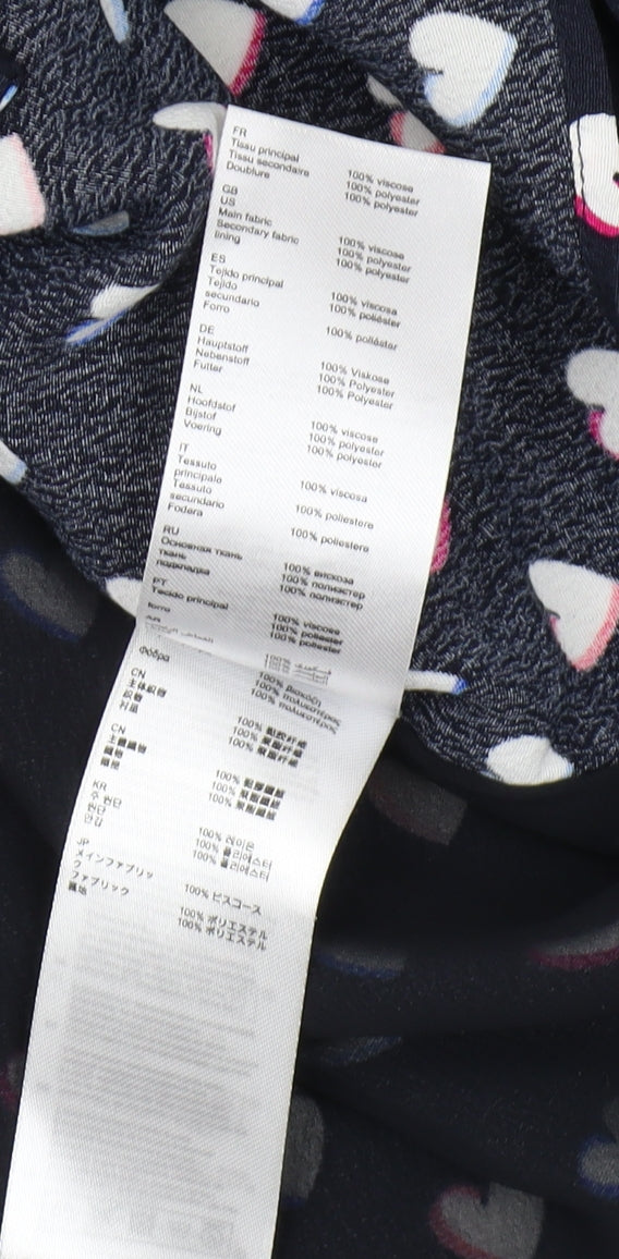 This charming Claudie Pierlot button-up shirt, designed for women, combines style and comfort flawlessly. Featuring a multicoloured heart pattern on a classic black background, this shirt adds a playful yet sophisticated touch to any outfit. Crafted from 100% viscose, it ensures a lightweight and breathable wear ideal for casual settings. With its regular size 12 fit, long sleeves, and collared neckline, it provides a flattering silhouette suitable for all-day wear. The button closure enhances its elegant look, making it a versatile piece in your wardrobe. Perfect for casual occasions, it seamlessly pairs with jeans or skirts for a chic appearance. In excellent condition with no visible defects, this machine-washable shirt offers hassle-free maintenance. Elevate your style with this unique and delightful wardrobe staple, ideal for casual outings and everyday wear.