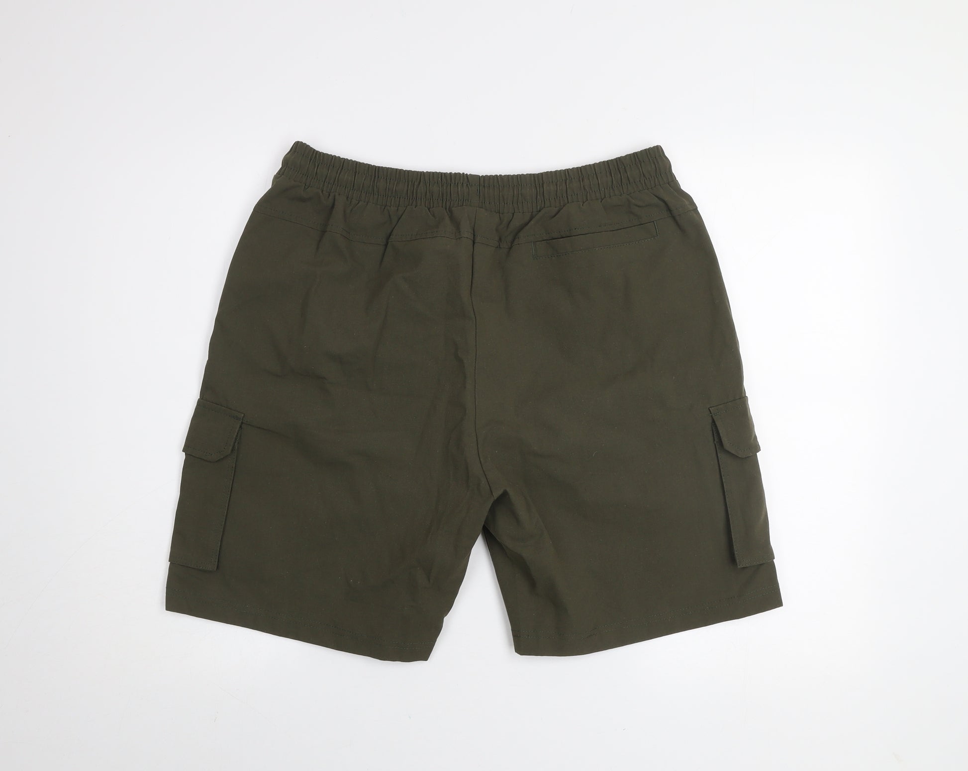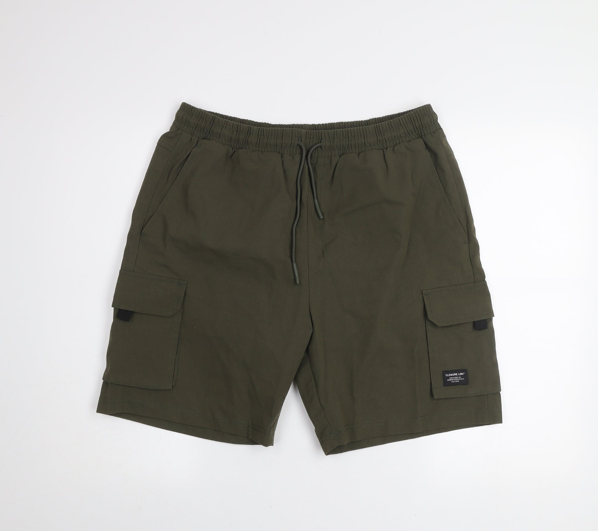 These Closure LDN men's cargo shorts in a versatile shade of green offer the ideal balance between practicality and laid-back style. Crafted from a durable and breathable blend of 65% polyester and 35% cotton, they provide both comfort and lasting wear—perfect for warm-weather days or light outdoor activities. The shorts feature a regular fit that allows ease of movement, complemented by an elastic waistband with an adjustable drawstring for a personalised fit. With a flat front design and multiple functional pockets including side cargo and slash styles, these shorts combine utility with an effortlessly modern look. The lightweight fabric ensures comfort whether you’re out for a casual day, travelling, or relaxing at home. The detail branding patch above the cargo pocket gives a stylish finishing touch without overpowering the clean design.Adaptable for spring through autumn, these shorts make an excellent companion for everyday wear or weekend adventures. Their mid-rise cut ensures a comfortable, flattering fit, while the green colour pairs easily with neutral shirts, polos, or tees. Designed for the modern man who values both style and utility, these Closure LDN cargo shorts are an essential piece for any casual wardrobe.In excellent pre-owned condition, they show minimal signs of wear and retain full structure and quality. Machine washable and easy to care for, they offer both durability and convenience, perfect for everyday versatility. Pair them with trainers and a casual top for an effortless off-duty look that’s practical and stylish.Whether you're heading outdoors, running errands, or lounging with friends, these shorts deliver comfort, function, and understated style in one reliable piece.