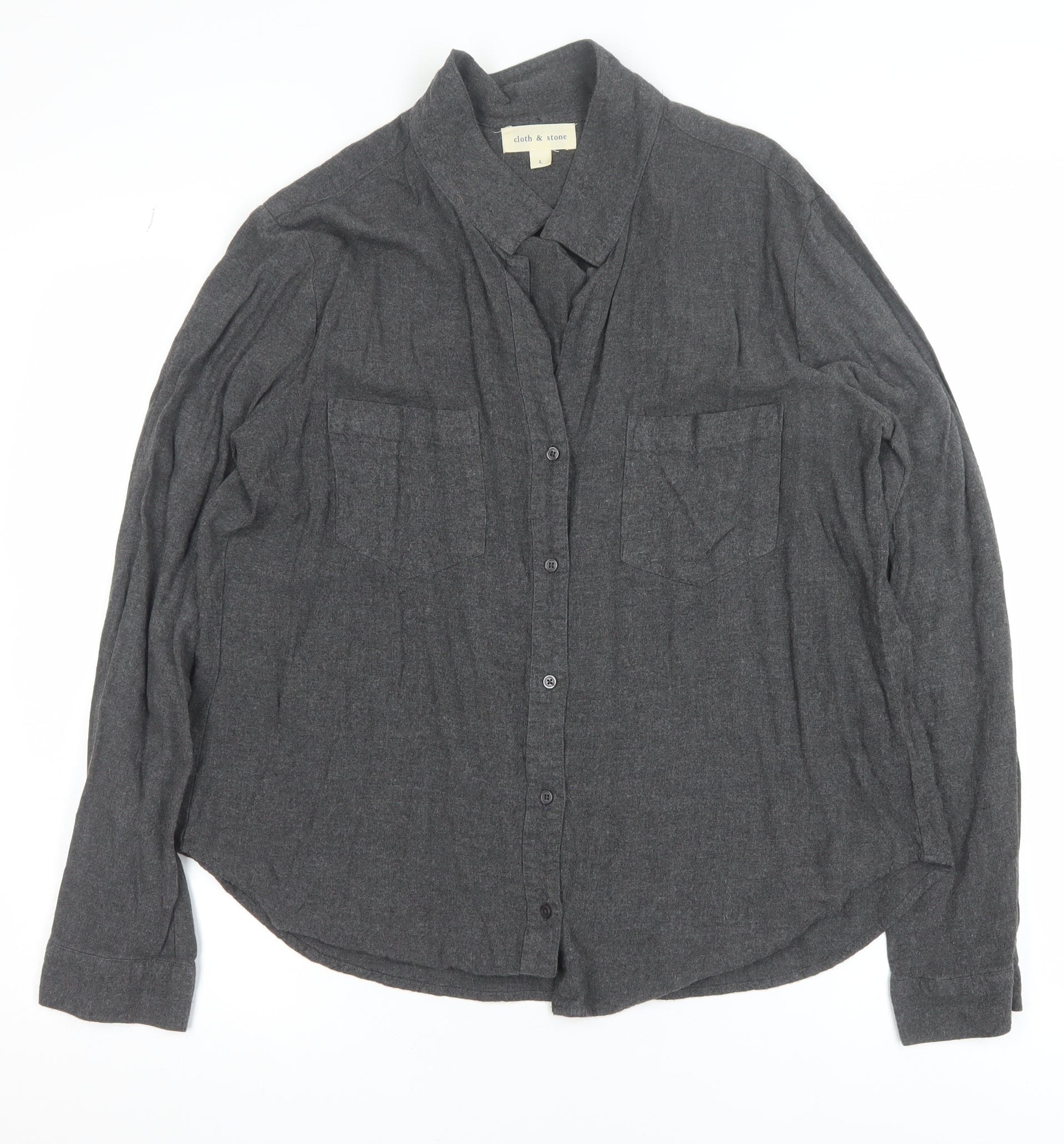 Add timeless appeal to your wardrobe with this effortlessly stylish grey button-up shirt from Cloth & Stone. Expertly made from soft 100% rayon fabric, this piece delivers a relaxed drape and lightweight comfort, ideal for year-round wear. Designed with a collared neckline and full button-down front, this shirt can be worn casually open over a cami or buttoned up for a classic silhouette. The long sleeves feature button cuffs, adding subtle structure to the loose-fit profile. Two front chest pockets give it a laid-back yet practical look while maintaining a refined feel suitable for everyday and semi-smart occasions alike.The dark grey colour ensures easy coordination with denim, trousers, or skirts, offering versatility for office, travel, or casual days out. Its breathable rayon material makes it comfortable for autumn and spring transitions, while the relaxed shape flatters a variety of body types. Style it tucked in or loose for a more effortless aesthetic.Perfect for women seeking comfort, understated sophistication, and a hint of modern simplicity, this Cloth & Stone shirt is a wardrobe essential that blends quality craftsmanship with versatile design. Its smooth texture and fluid movement create a polished yet effortless appearance. Whether you prefer minimalist styling or love layering, this piece is ready to complement your fashion sense beautifully. In excellent pre-owned condition with minimal signs of wear, it’s ready to deliver both comfort and easy elegance at a fraction of the original price.