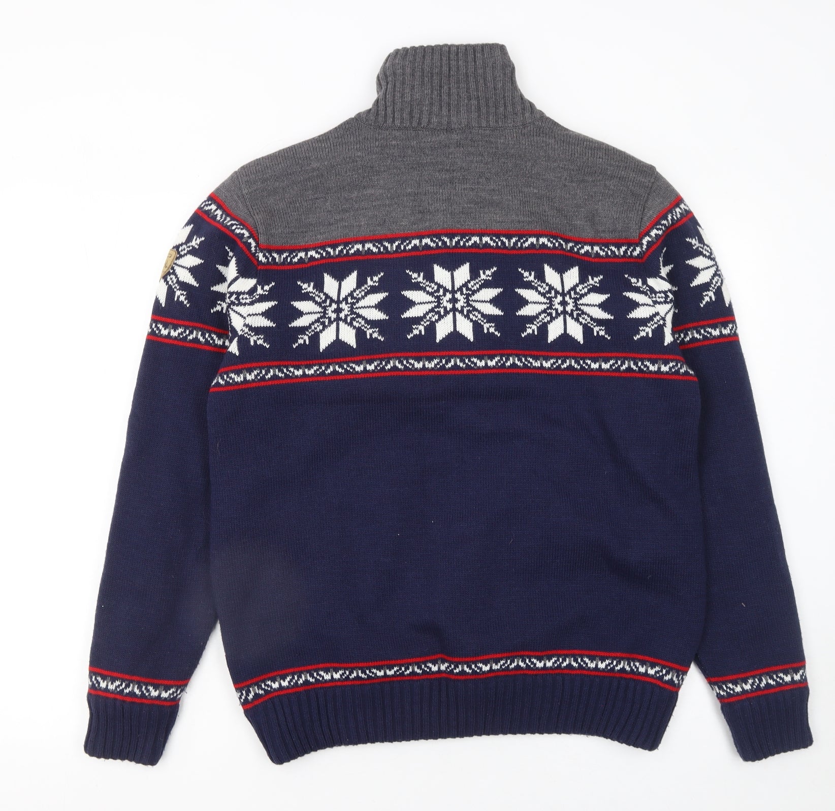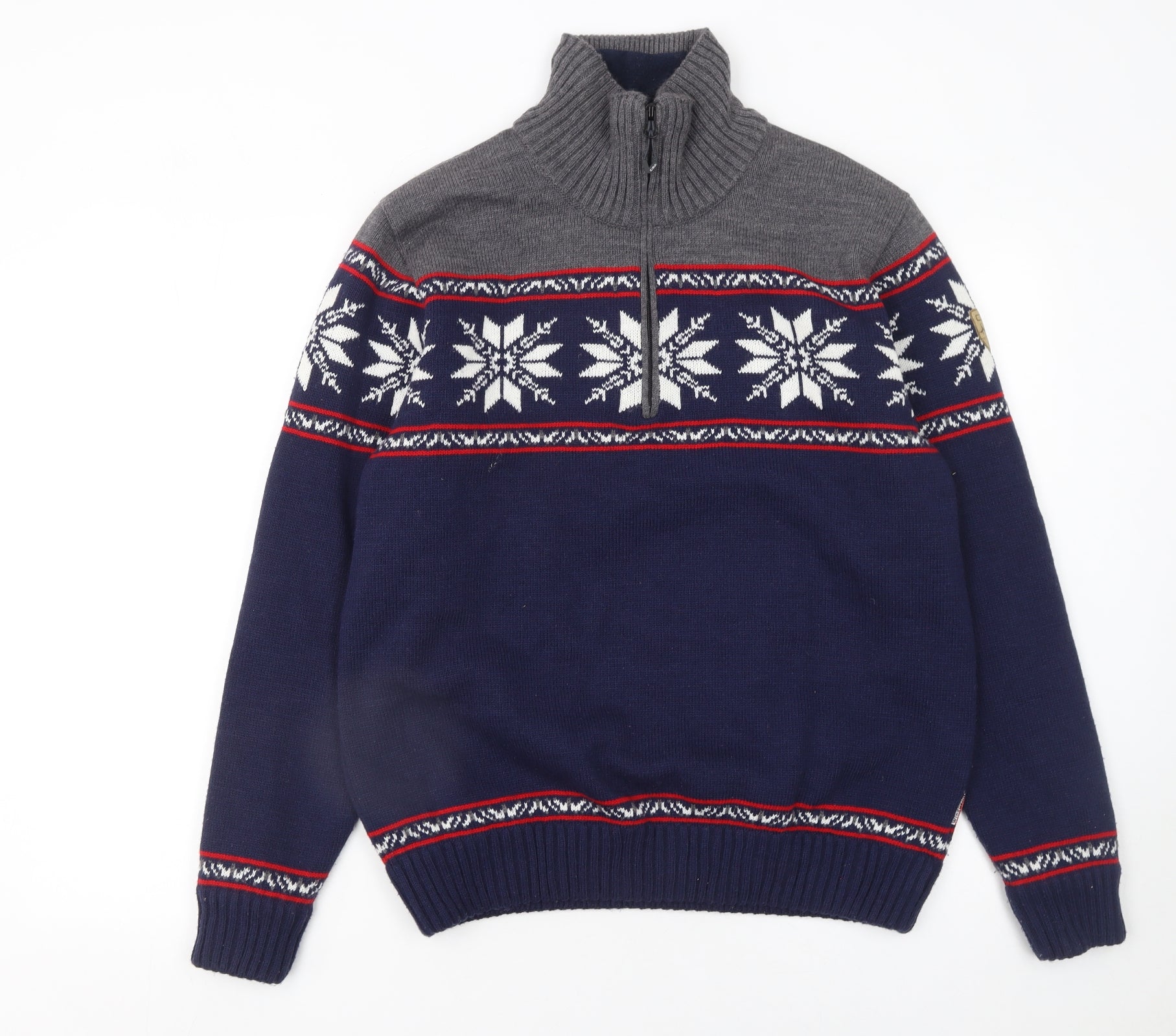 Step into the colder months in style with this CMP men’s wool blend jumper. Combining quality craftsmanship and a classic Fair Isle pattern, this navy and grey half-zip pullover offers both warmth and sophistication. Made from a soft blend of wool and acrylic, it provides excellent insulation while keeping a comfortable, breathable feel ideal for everyday wear. The stylish high neck design and quarter zip fastening lend a sporty, alpine appeal that works perfectly for layering over a shirt or under a jacket. The snowflake-inspired pattern, woven across the chest and sleeves, adds a distinctive winter charm that makes this a standout choice for the festive season or ski trips. Designed with comfort in mind, it features a ribbed hem and cuffs that help retain warmth and maintain shape. Pair it with jeans or chinos for casual weekends, outdoor walks, or evenings by the fire. This knit is in excellent pre-loved condition, showing only light signs of wear and no major flaws. A versatile addition to any man’s wardrobe, this CMP jumper balances rugged outdoor style with everyday comfort — ready to keep you warm and stylish through the cold seasons. Whether worn après-ski, at a Christmas market, or simply on a brisk morning stroll, it’s a piece that blends practicality with timeless design. Don’t miss the chance to add this high-quality, beautifully patterned winter jumper to your collection — a cold-weather essential offering comfort, warmth and a touch of festive style.