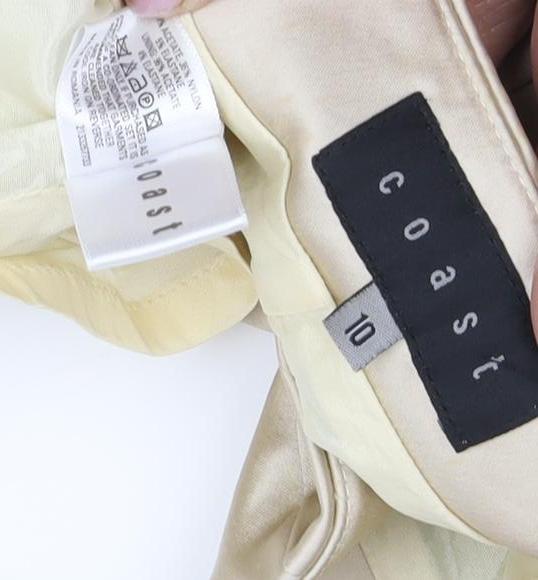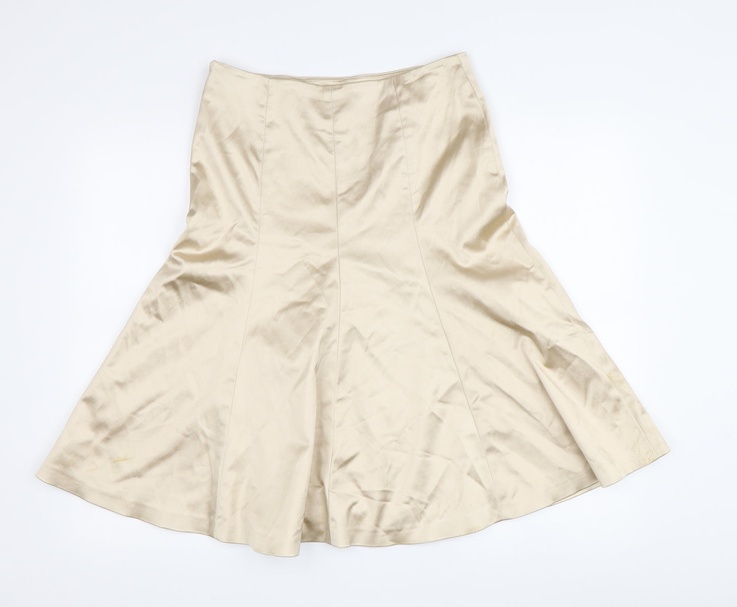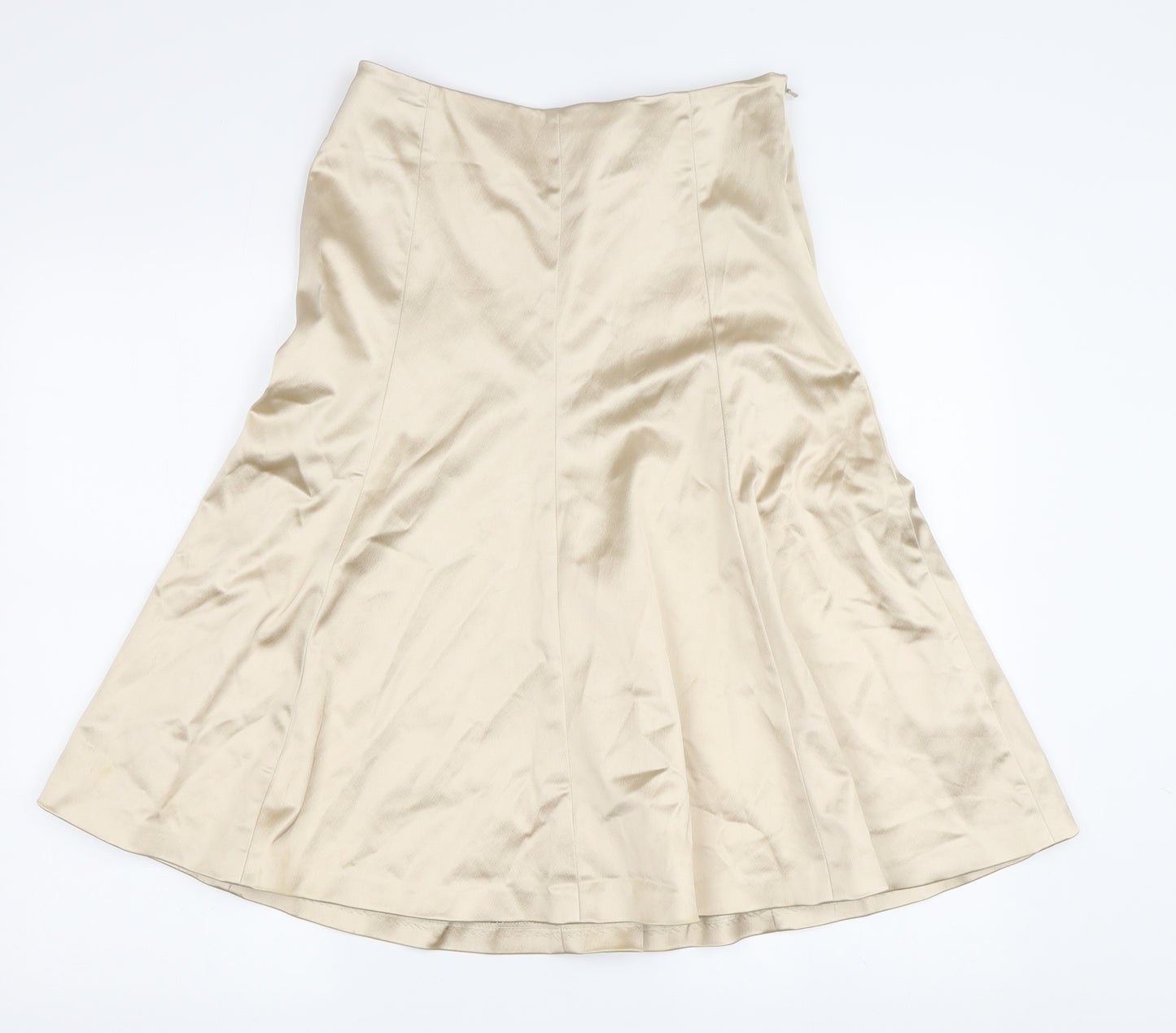 Crafted from luxurious silk with an added touch of elastane for a comfortable fit, this beige A-Line skirt by Coast is a splendid addition to any wardrobe. The skirt falls to a graceful midi length, offering a versatile piece suitable for various occasions. Its delicate beige tone exudes elegance, while the simplicity of the design keeps it contemporary and stylish. This skirt is fitted with a convenient zip closure, ensuring a secure fit. The fabric is smooth and breathable, making it a delightful choice for all-day wear. Although exhibiting some light stains near the hem, this piece retains its charm and can be beautifully paired with a range of tops and accessories for a complete look. Ideal for those seeking to add a touch of class to their attire in a nearly new condition, this garment is priced excellently for its quality and brand. Experience the luxury and enduring style of Coast with this essential piece.