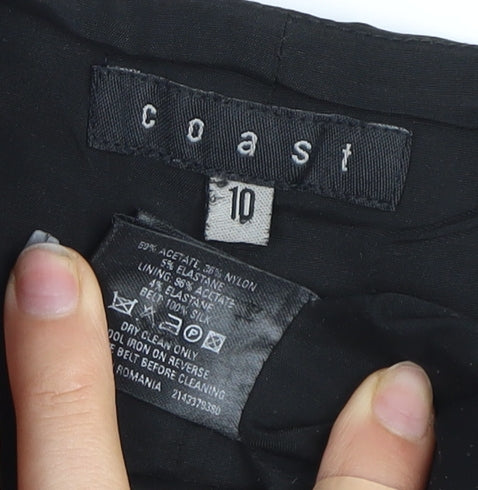Elevate your wardrobe with this elegant Coast Women's Black Sheath Dress. Tailored to perfection, this knee-length dress features a chic square neckline and a stylish bow accent at the waist, perfect for adding a touch of flair to formal occasions, weddings, or cocktail parties. Crafted from a luxurious blend of 59% acetate, 38% nylon, and 3% elastane, the fabric offers a slight stretch for a flattering fit that enhances your silhouette. The durable woven material is designed for comfort and style, making it ideal for both autumn and spring seasons.The dress comes in a versatile size 10 and is part of Coast's acclaimed collection, known for sophisticated designs and quality craftsmanship. Its classic black colour provides endless styling possibilities, allowing you to pair it with your favourite accessories for a look that stands out. The elegant sheath style, complemented by a belted waist, adds a touch of sophistication and highlights your curves, while the sleek zip closure ensures a smooth, comfortable fit.Designed with a strappy sleeveless cut, this piece maintains a timeless appeal, suitable for many occasions. The minimalist design is completed with no pattern embellishments, offering a canvas for personalization, whether paired with a statement necklace or simple clutch. With this dress, you're not just buying clothing; you're investing in a piece that enhances confidence and style, ensuring you make a memorable impression at any event. Impeccably maintained and in excellent condition, it's the perfect addition to any chic wardrobe.