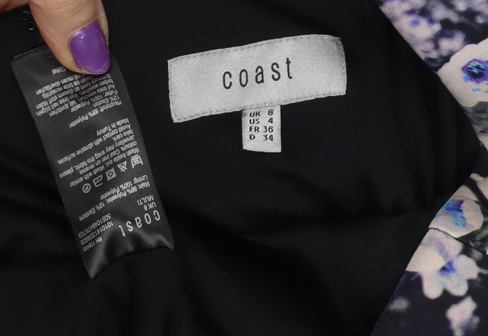 Step into elegance with this exquisite Coast Women's Floral Sheath Dress, designed to make an impression at any party or cocktail event. Crafted for the contemporary woman, this knee-length dress features a vibrant multicoloured floral pattern, perfect for bringing a touch of spring and summer charm to your wardrobe. Fashioned in a classic sheath style, it offers a sophisticated silhouette that effortlessly flatters the figure. The dress is constructed from a luxurious blend of polyester and elastane, providing a comfortable yet form-fitting wear. With its sleeveless design and scoop neckline, it elegantly accentuates your shoulders, while the concealed zip closure ensures a seamless finish.Ideal for those special occasions, this dress embodies the effortless style that Coast is renowned for. The timeless floral print adds a note of natural beauty, making it a versatile choice whether you're attending a wedding or a summer garden party. Easy to care for, it is machine washable, ensuring that maintaining its pristine look is as effortless as wearing it. Offered in size 8, this dress invites you to embrace sophistication with a modern twist.Experience the quality and design associated with the Coast brand, and let this stunning piece be your go-to option for an array of events. Whether you're celebrating with friends or enjoying an evening dinner, this floral sheath dress promises to be a stylish and lasting addition to your collection.