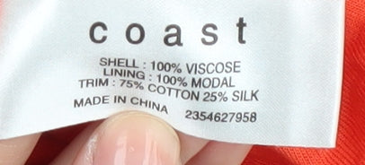 Enhance your summer wardrobe with this vibrant orange blouse from Coast, designed for women who love to make a statement. Ideal for casual occasions, this sleeveless blouse features a stylish V-neckline adorned with playful ruffle accents, bringing a touch of elegance and flair to your ensemble. Crafted from 100% viscose, the soft and lightweight fabric offers comfort and breathability, perfect for warm summer days. The solid orange colour adds a bold pop to any outfit, making it easy to pair with your favourite shorts or jeans for a chic, relaxed look. Despite slight creasing visible, the blouse remains in excellent condition, ensuring a fresh appearance with each wear. Its pullover closure facilitates easy wear, and the garment is machine washable, making it a practical choice for everyday use. Embrace the bold style and comfort of this Coast blouse and elevate your wardrobe effortlessly.