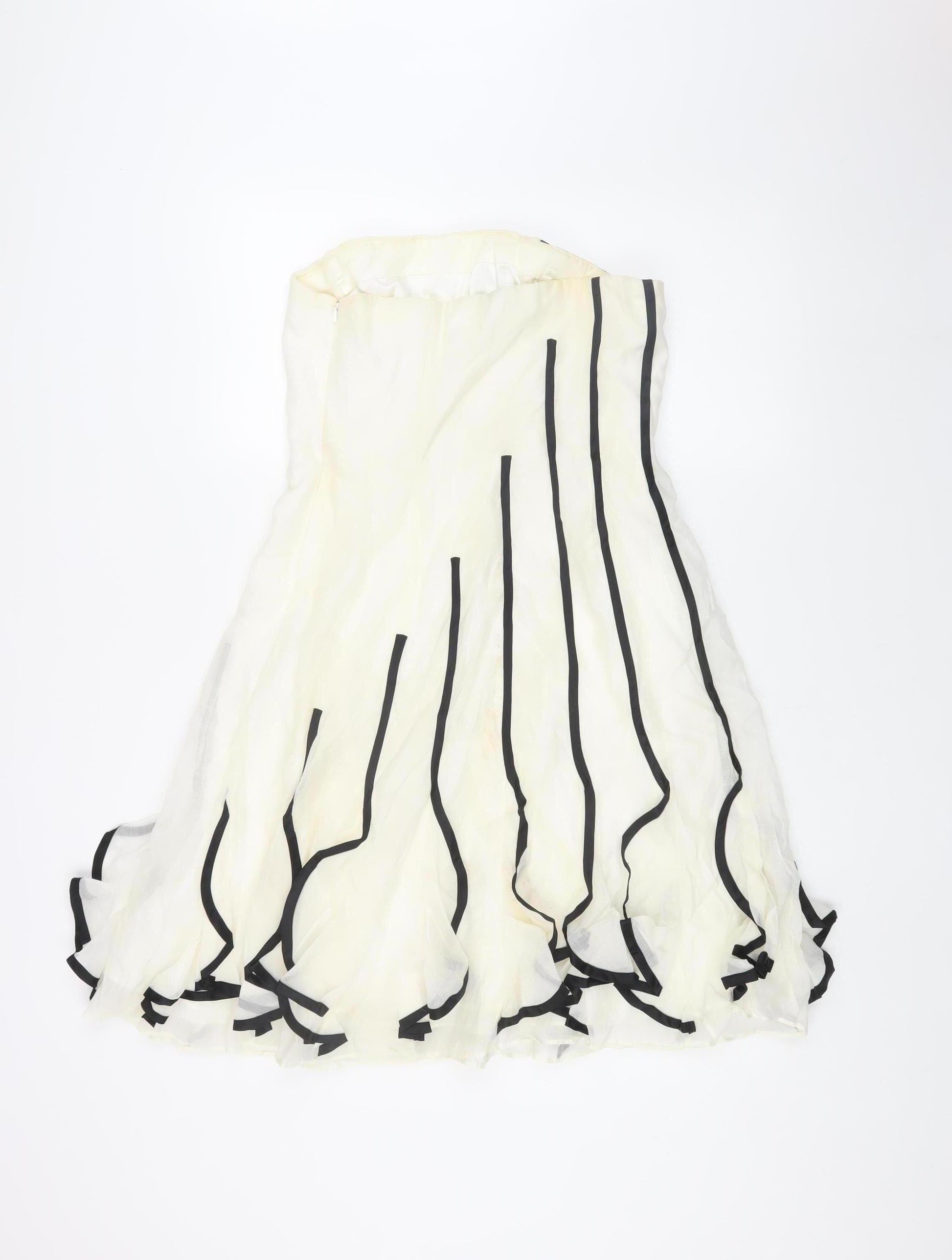 This elegant Coast Women's A-Line Midi Dress in size 12 is the perfect addition to your wardrobe for formal occasions, weddings, or cocktail parties. Crafted from a luxurious blend of 70% cotton and 30% silk, this dress offers a breathable and comfortable fit that is ideal for both spring and summer events. The dress features a sophisticated white base complemented by a striking black striped pattern, creating a timeless look that exudes class. Designed with a strapless neckline and sleeveless style, it provides a flattering silhouette that enhances your natural curves. The ruffle accents at the hem add a playful touch to the classic design. Despite being in excellent used condition with slight wear, this dress is lined for added quality and durability, ensuring you look fabulous with every wear. The lightweight woven fabric makes it easy to move around, keeping you comfortable all day long. Get this statement piece and stand out at any event effortlessly.