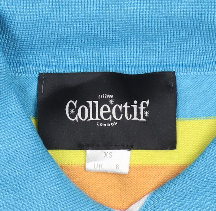 Add a vibrant touch to your wardrobe with this charming Collectif women’s jumper. Beautifully designed in a playful rainbow stripe pattern, this jumper captures a nostalgic retro feel while maintaining a fun contemporary twist. The pastel stripes in yellow, pink, purple, orange, and blue are complemented by embroidered star accents across the chest, making it a statement piece that radiates positivity and style. Crafted from a lightweight, tight-knit blended fabric of 70% viscose and 30% nylon, it provides a wonderfully soft touch and natural stretch for a comfortable fit. The collared neckline adds a polished, feminine touch, reminiscent of vintage-inspired designs. Styled with puff long sleeves and a fitted ribbed hem, the jumper flatters the silhouette while allowing ease of movement. Perfect for layering or standing out on its own, this jumper is suited for spring and summer wear, though it works equally well as a layering piece in cooler months. Ideal for casual days out, adding colour to office casual looks, or pairing with high-waisted jeans for a throwback look, this Collectif jumper brings instant cheer and charm. In excellent condition with minimal signs of wear and no visible damage, it’s ready to bring joy to its new owner. A true statement piece for fashion lovers seeking unique, vibrant vintage-inspired apparel with modern comfort and style. Don’t miss the opportunity to add this unique and eye-catching Collectif rainbow collared jumper to your collection – a perfect pick for injecting colour and character into your everyday style.
