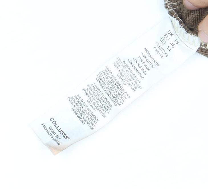 Elevate your casual wardrobe with this stylish Collusion T-Shirt, perfect for unisex adults seeking comfort and style. Crafted from 100% cotton, this brown t-shirt features a classic V-neck design, adding a touch of sophistication to your everyday look. The sleeveless style makes it an ideal choice for warmer months or layering under a jacket. With a regular size fit, it is suitable for anyone looking for comfortable and breathable wear. Its solid brown hue offers versatility, allowing it to pair seamlessly with various outfits. Whether you're lounging at home or stepping out for a casual outing, this t-shirt is designed to match your lifestyle. Machine washable for easy care, this item promises durability and longevity, keeping it a staple piece in your wardrobe. Though it is pre-owned, it remains in excellent condition with no visible stains or damage, just a bit of natural wrinkling that adds character to its look. An ideal choice for those who appreciate quality and comfort, this Collusion t-shirt combines practicality with style. Invest in this essential piece and enjoy the blend of simplicity and fashion it brings to your clothing collection.