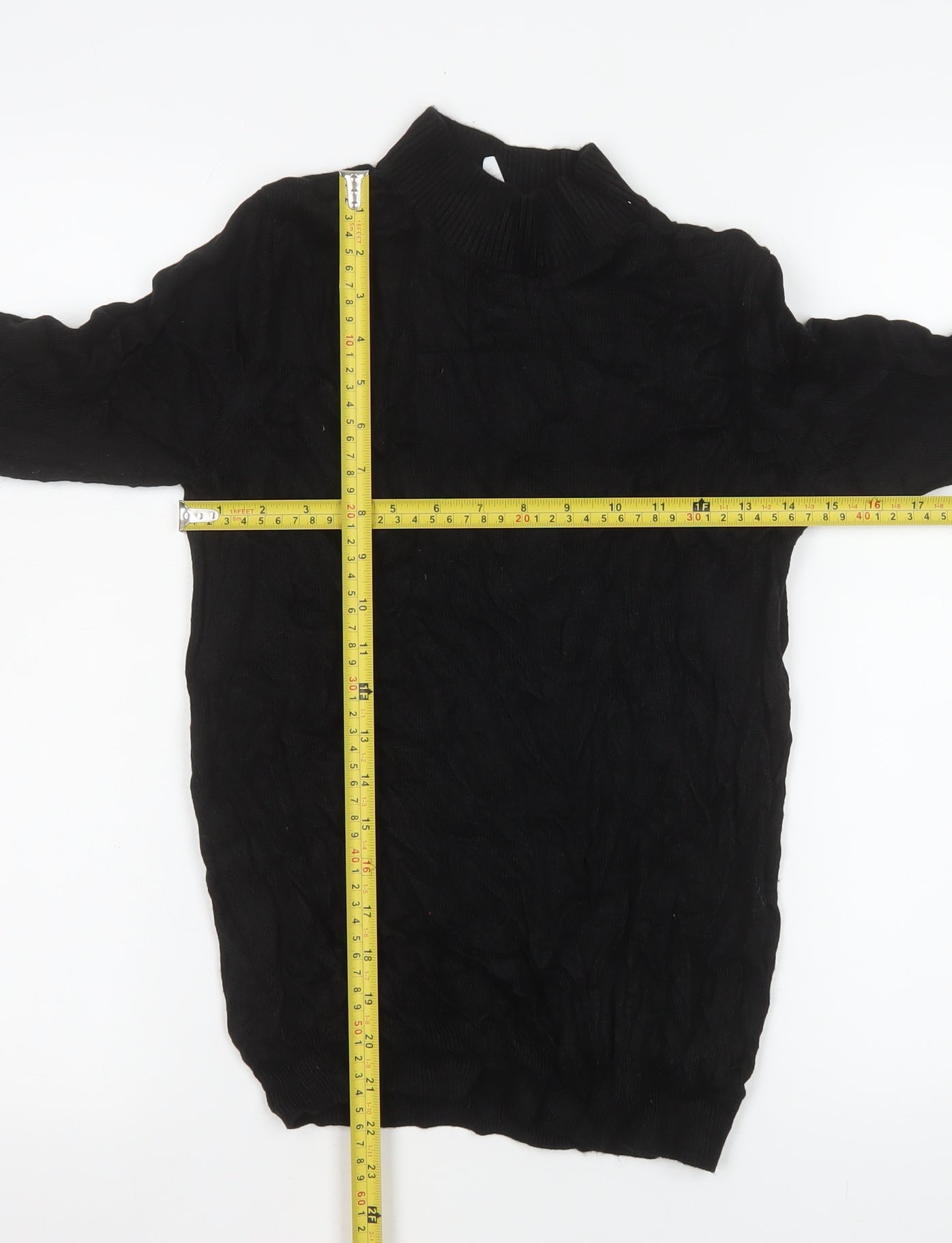 This women’s black knit jumper from Collusion is a perfect blend of simplicity, style, and comfort. Designed with a flattering mock neck neckline and long sleeves, it offers a sleek silhouette ideal for layering or wearing as a standalone piece. The jumper is made entirely from soft acrylic, giving it a lightweight yet warm feel suitable for cooler autumn and winter days. Its regular fit ensures ease of movement while maintaining a tidy, classic look. The solid black colour is versatile and effortlessly pairs with jeans, skirts, or trousers for both casual and smart-casual occasions. The fabric is machine washable, making it practical for everyday wear. Despite showing minor creasing from storage, it remains in excellent condition with no visible flaws or damage. This timeless black jumper delivers a comfortable fit and a minimalist aesthetic that easily transitions between seasons. Ideal for women who value versatile wardrobe staples, it’s a must-have layering essential that works well under jackets, coats, or even pinafore dresses. The mock neck design adds a touch of sophistication while still retaining a contemporary appeal that complements Collusion’s signature style. Whether you’re dressing for a relaxed day out or creating a cosy home outfit, this jumper combines softness, durability, and effortless wearability. With its durable knit fabric and adaptable design, it’s easy to see why this piece remains a wardrobe favourite year after year. Perfect for casual occasions, weekend wear, or workplace comfort, this Collusion black knit jumper embodies modern understated fashion with an edge of warmth and versatility.
