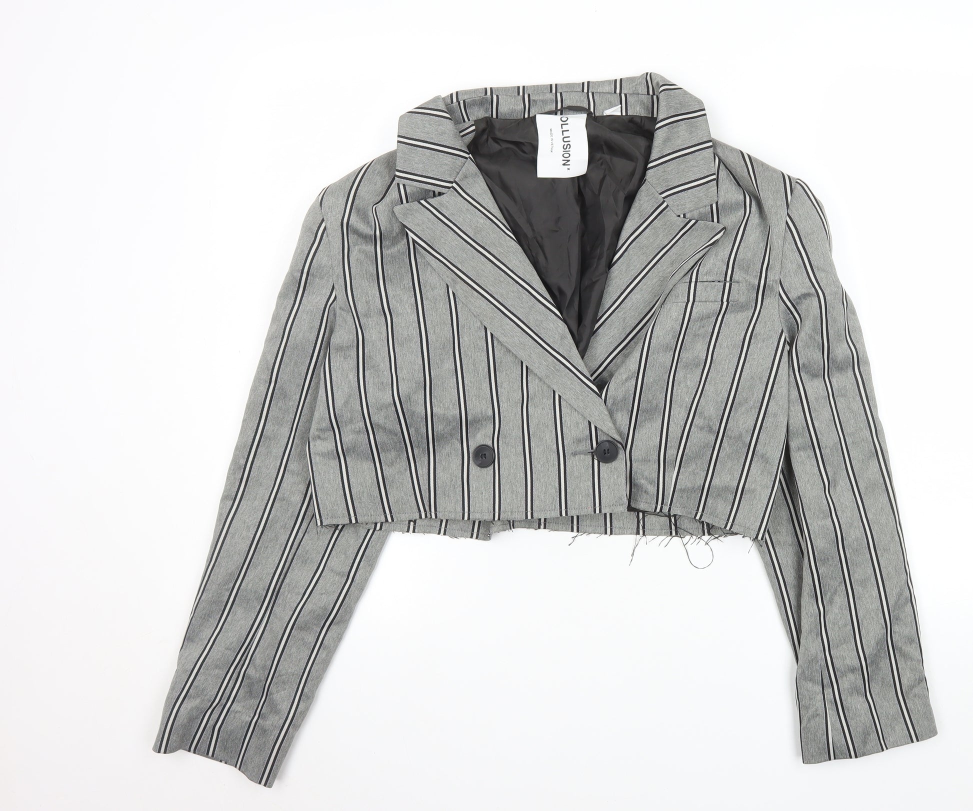 Step into contemporary tailoring with this Collusion women's cropped double-breasted blazer in classic grey with bold black pinstripes. Designed in a structured yet slightly relaxed silhouette, this jacket combines a sharp tailored look with modern streetwear sensibility. Crafted from a soft woven blend of polyester, viscose, and elastane, it offers both comfort and flexibility, making it an ideal piece for smart-casual or trend-driven outfits. The notched lapels, long sleeves, and cropped length provide an edgy contrast to its timeless pinstripe pattern, while its lightweight lining ensures a smooth fit and enhanced durability. This jacket fastens with two front buttons and includes back sleeve button detailing for a polished finish. A great choice for women looking to elevate basics or add sophistication to their look for spring or autumn occasions. The design sits beautifully on the waist, pairing effortlessly with high-waisted trousers, skirts, or jeans, ideal for parties, nights out, or creative work settings. Although lightly used, it remains in excellent pre-owned condition, displaying only minimal fraying to the raw hemline, adding a fashionably deconstructed touch. The versatile grey tone ensures it complements a range of colours and styles, perfect for styling layered outfits. Discover easy sophistication with this cropped blazer from Collusion – a piece that aligns with both classic and modern urban aesthetics, making it a perfect blend of smart fashion and individuality.