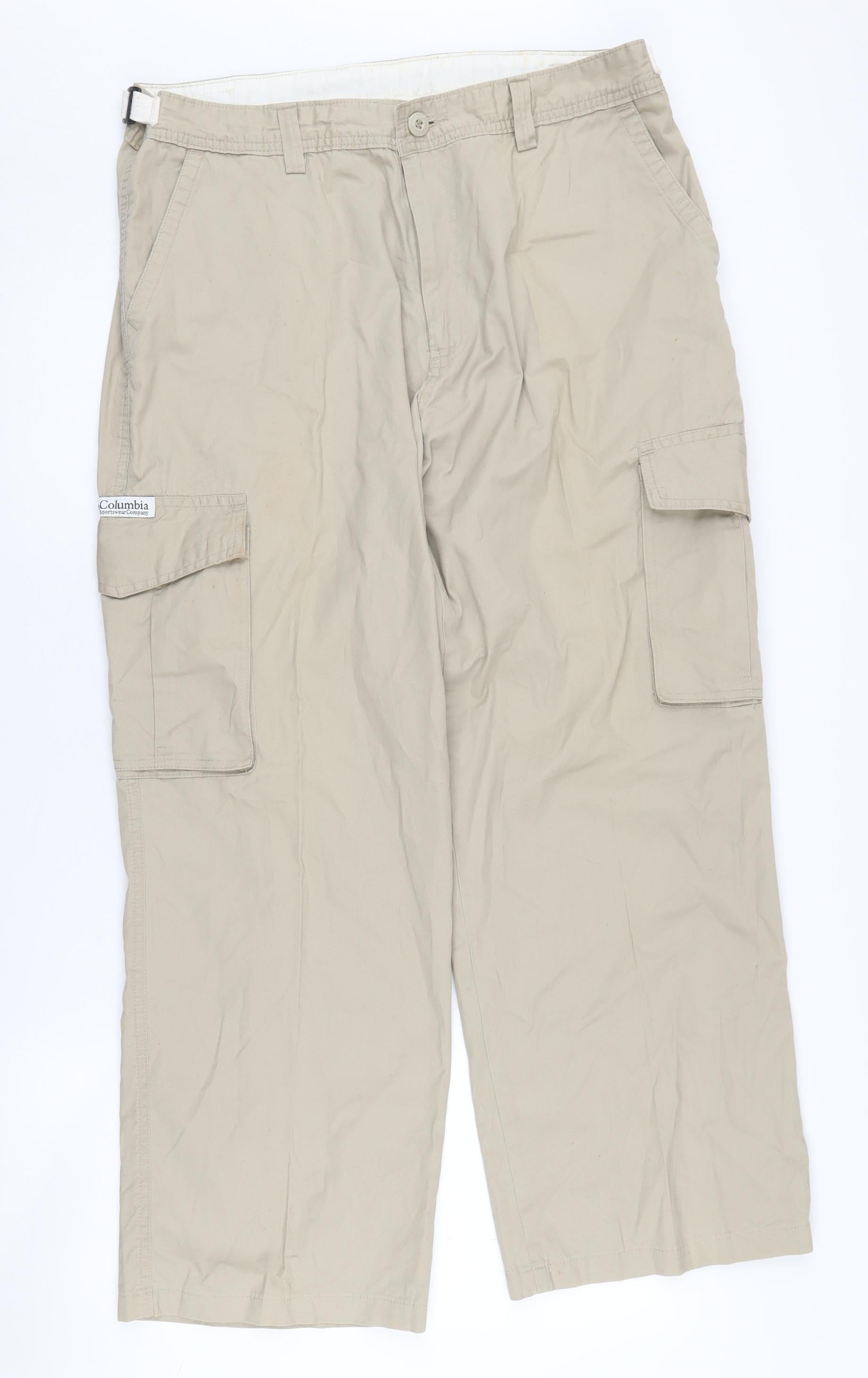 Step into comfort with these Columbia men's cargo trousers, crafted in a versatile beige hue. Designed for casual wear, these trousers offer utility and style, featuring a regular fit that flatters the silhouette with ease. The durable fabric ensures longevity, while the cargo pocket design adds both functionality and a rugged aesthetic, perfect for a day outdoors or a relaxed city stroll.These trousers boast a straight leg style, enhancing mobility and comfort, suitable for the warmer months with their summer season build. They are equipped with convenient button and zip closure for a secure fit, making them both practical and stylish. With a mid-rise waistline and regular size type, these trousers cater to a variety of body types, ensuring ease of wear and style flexibility.Crafted with machine washable cotton, these trousers are easy to care for, ensuring they remain a staple in your wardrobe. Although in good used condition, they exhibit light stains, offering a unique character to the garment while still maintaining their classic look. Grab this pair for your next adventure or casual outing, and experience the blend of Columbia's reliability and style.