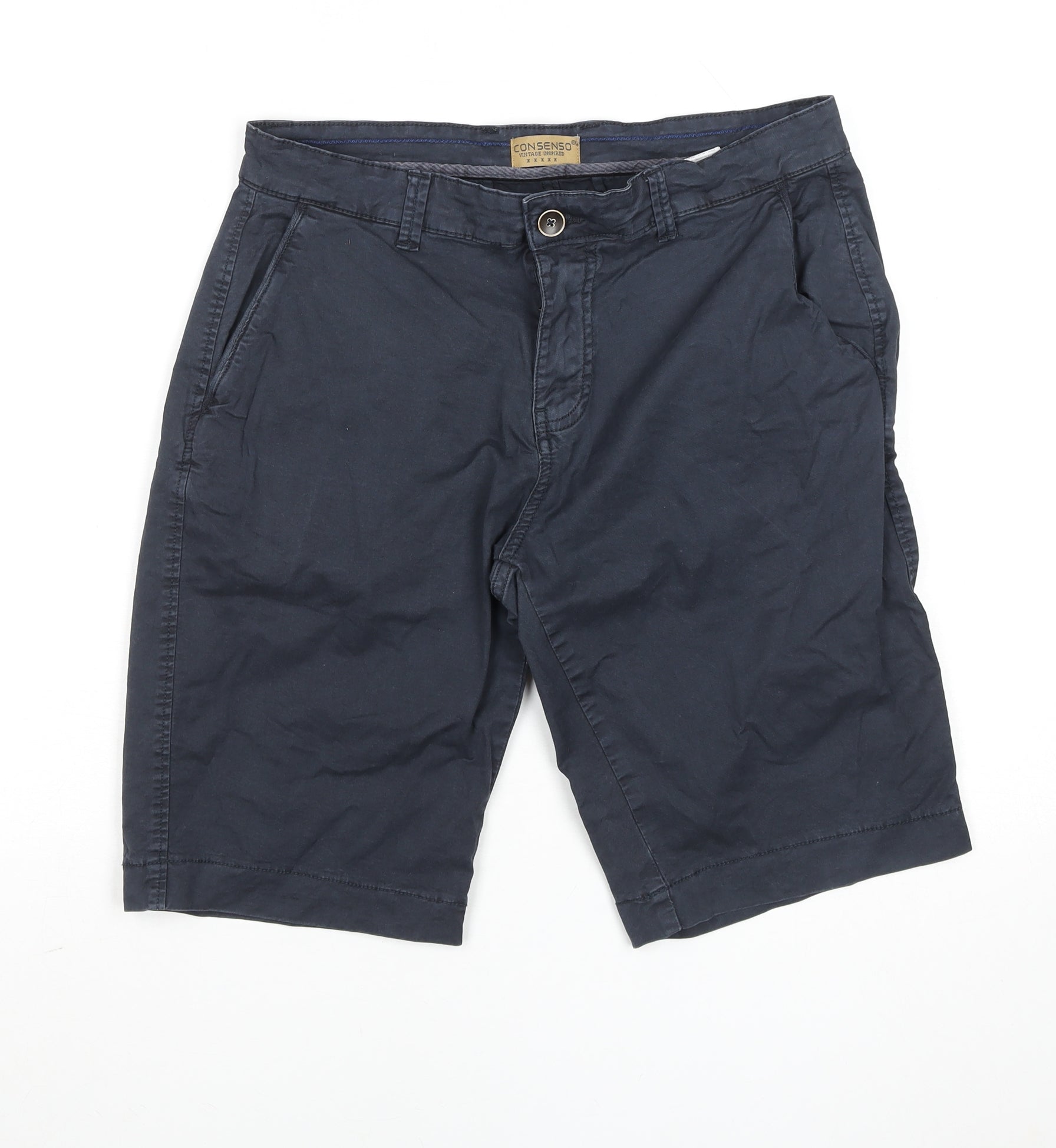Step out in timeless casual comfort with these Consenso men’s chino shorts in a refined navy blue hue. Crafted from a quality cotton-elastane blend, they offer the perfect balance between softness, durability, and a gentle stretch for ease of movement. Designed with both style and practicality in mind, these shorts feature a traditional flat front, belt loops, and secure button-and-zip fastening. Front slash pockets and two buttoned back pockets provide ample space for essentials while maintaining a clean, tailored silhouette.The Chino design makes them ideal for everyday wear—from weekend leisure and travel to relaxed gatherings or summer outings. Their medium-weight canvas fabric ensures breathable comfort that keeps you cool while maintaining a polished appearance. The versatile navy tone pairs effortlessly with shirts, polos, or casual tees, making them a dependable wardrobe staple for both spring and summer seasons.Their regular fit and mid-rise waist deliver a flattering, modern cut suitable for a variety of body shapes. Easy to care for and lightweight, the cotton-elastane blend also means these shorts retain their shape throughout repeated wear. While gently worn, they remain in very good condition with only light signs of use and some minor creasing consistent with storage.Perfect for men who appreciate understated sophistication without sacrificing comfort, these Consenso chino shorts combine practicality with effortless European style. Great for casual occasions, travel adventures, or weekend socials, they are an essential piece offering lasting appeal. Add them to your wardrobe for a classic, comfortable, and stylish warm-weather option that you’ll reach for season after season.