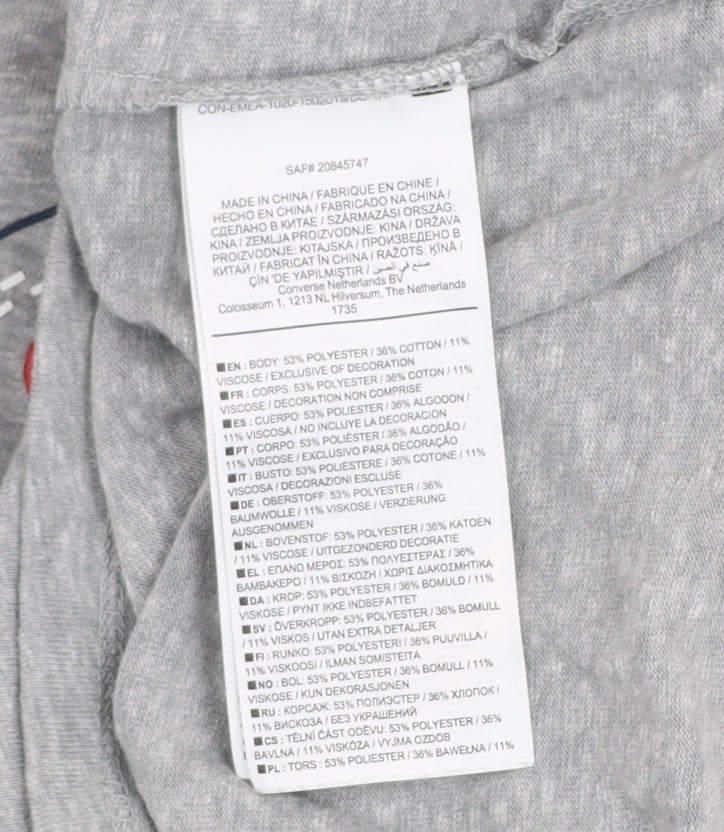 Add a touch of authentic sports-inspired style to your wardrobe with this Converse All Star T-shirt for men. In a sleek grey colourway, it perfectly captures the brand’s iconic look with the bold Converse Chuck Taylor All Star logo printed front and centre. Crafted from a high-quality blend of polyester, cotton and viscose, this tee is soft, comfortable, and breathable—ideal for everyday wear. The short sleeves and classic crew neckline make it a versatile piece to pair with jeans, chinos, or joggers, offering an effortlessly cool and casual vibe. Designed to fit comfortably with a regular silhouette, this T-shirt works well layered under jackets and hoodies or worn alone during warmer weather. Its lightweight and moisture-wicking properties make it perfect for day-to-day wear or relaxed social outings. Whether you’re heading to the gym, hanging out with friends, or just relaxing at home, this Converse tee offers both comfort and style in equal measure. Easy to care for and machine washable, it’s a practical addition to any contemporary wardrobe. The soft jersey fabric gives it a smooth feel that doesn’t compromise durability, ensuring it remains in great shape even with regular use. This grey Converse All Star T-shirt brings together quality craftsmanship, timeless streetwear appeal, and an effortlessly confident look that the brand is known for. Wear it tucked in or loose for a laid-back finish. A must-have for Converse enthusiasts and fans of classic, comfortable fashion. Perfectly suited for spring, summer, and autumn seasons alike, it’s both a reliable staple and a standout favourite in any casual collection.