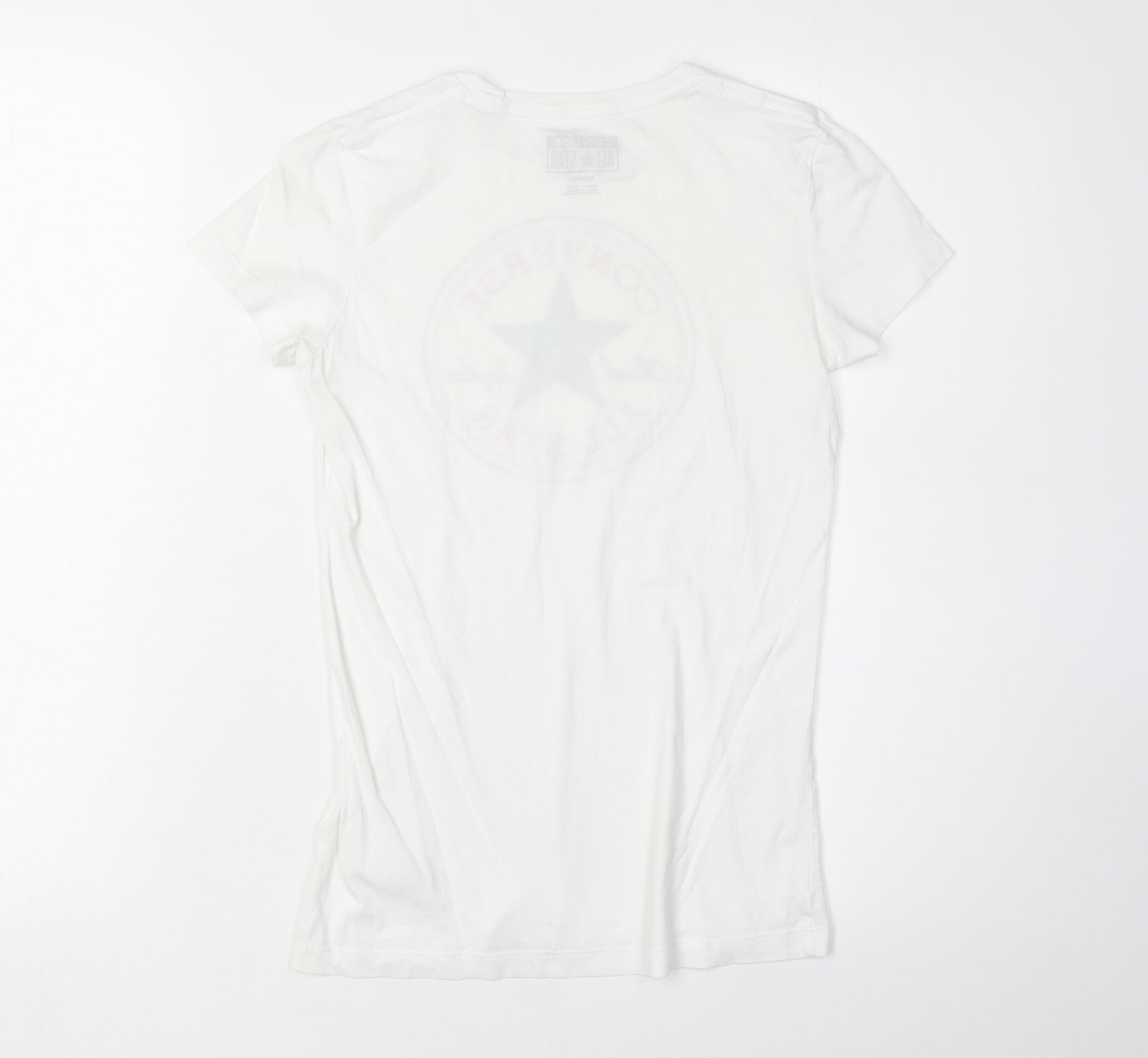 This Converse Women's White T-Shirt is crafted for aficionados of casual style. Featuring a classic crew neck and short sleeves, it embodies the essence of relaxed yet fashionable wear. Made from soft and breathable 100% cotton jersey, this top ensures all-day comfort, whether you're spending a day out or lounging at home. With an embroidered Converse All Star logo, it adds a touch of iconic branding to your laid-back look. The solid white colour and regular fit make it a versatile wardrobe staple, suitable for any season. Designed for women, this T-shirt is ideal for casual occasions, offering a lightweight and comfortable fit that complements jeans, shorts, or skirts. Machine washable for easy care, it stays looking fresh with minimal effort. Lightly worn but in excellent condition, this tee reflects its sporty theme while remaining subtly stylish. Ideal for an easy-going day or adding a touch of Converse flair to your everyday ensemble.