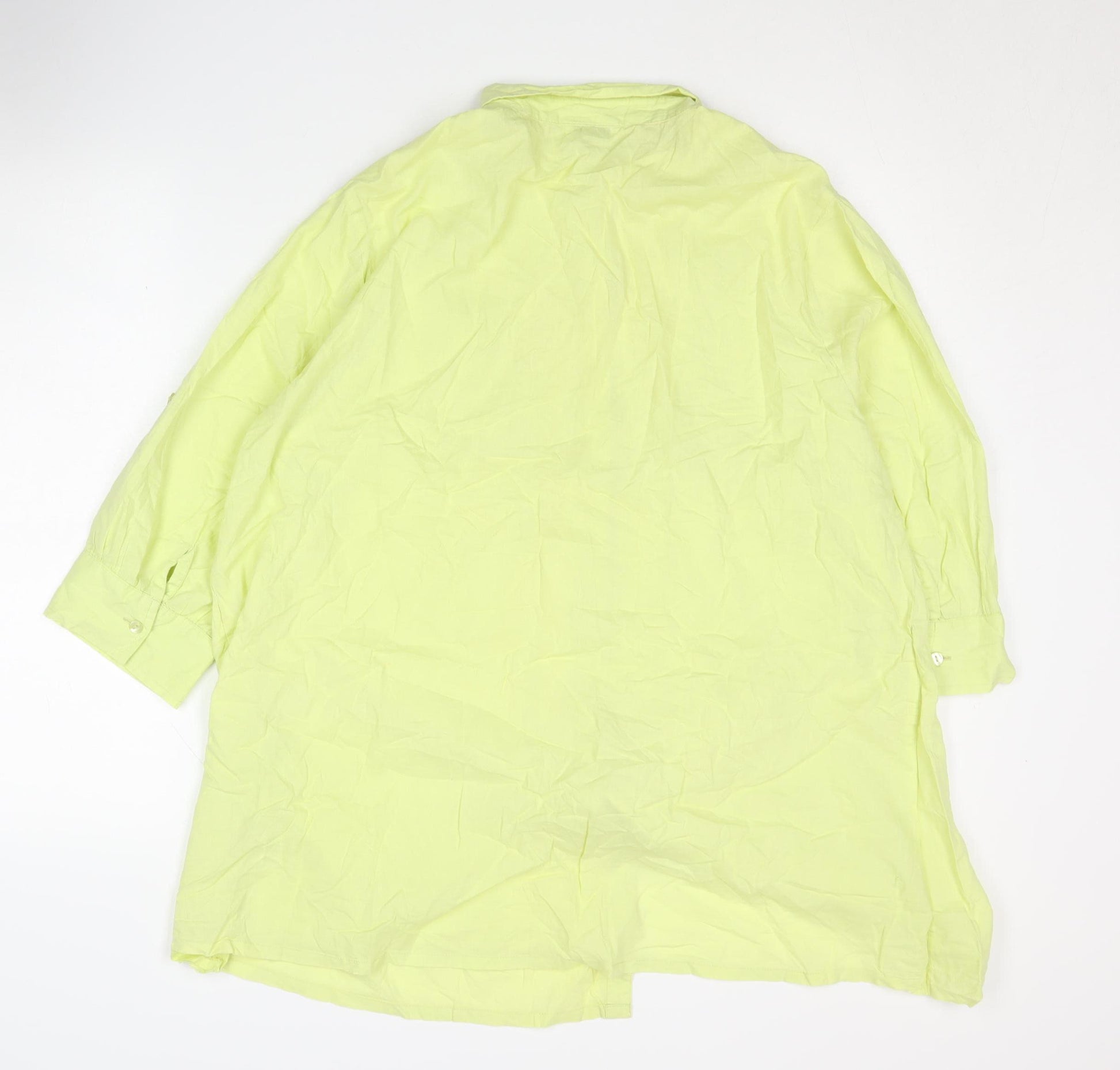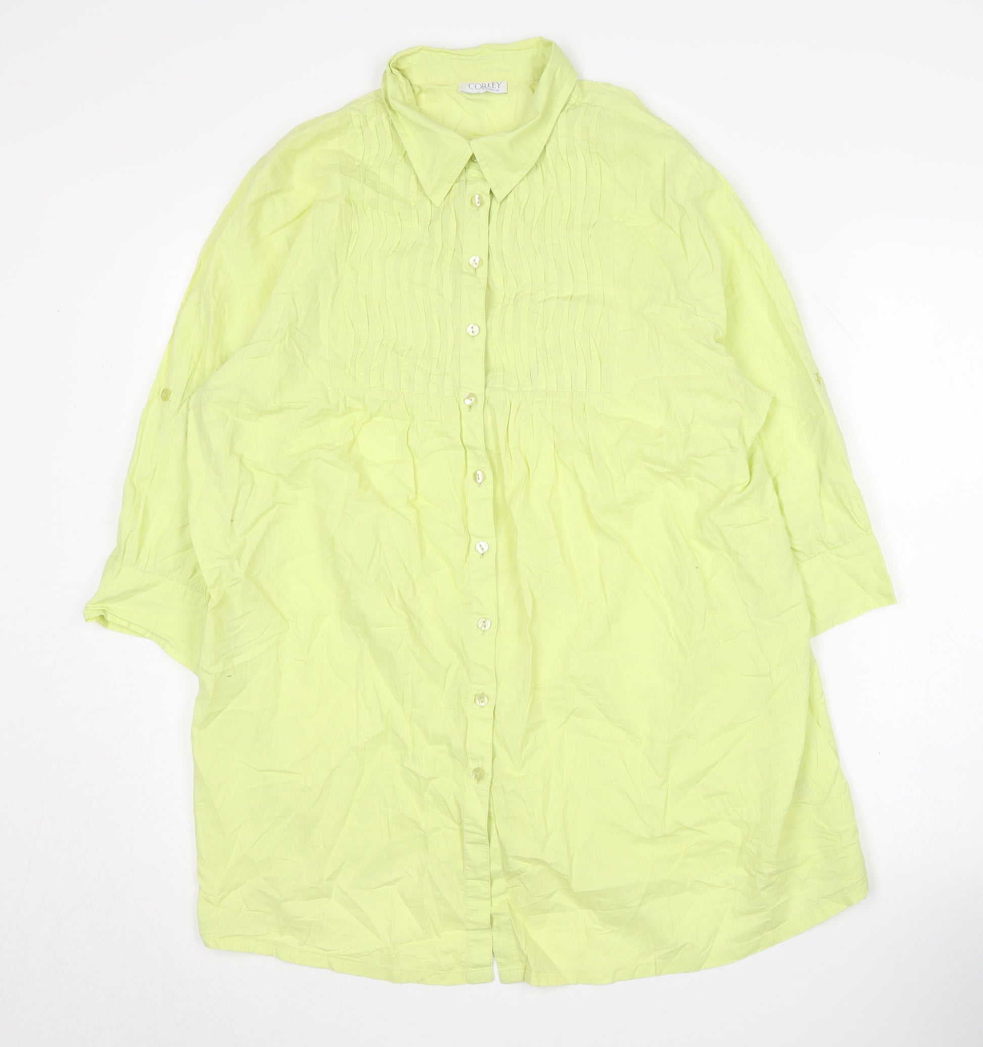 This charming Corley button-up shirt in a lovely green hue is perfect for casual outings or workwear. Designed for women, it features 3/4 roll tab sleeves and a classic collared neckline, adding a timeless elegance to your wardrobe. Crafted from 100% cotton, this shirt offers lightweight comfort ideal for any season. Its regular size 20 fit ensures a flattering, relaxed look that's easy to style with your favorite trousers or skirts. The solid pattern makes it versatile, while the button closure adds a touch of sophistication. Despite being in excellent condition, it has a naturally wrinkled fabric appearance, contributing to its casual charm. Embrace simplicity and effortless style with this beautiful shirt, a must-have addition to your collection.