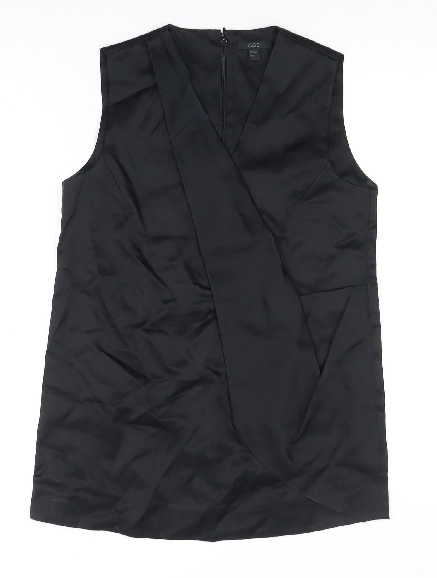 Introducing the COS Black Sleeveless Top in Size 8, a chic addition to any wardrobe. Crafted from a luxurious blend of viscose, modal, and wool, this top offers a sophisticated look with a solid black colour that can easily pair with a variety of outfits. The sleeveless design adds a modern touch, perfect for layering or wearing as a standalone piece. The top features a sleek zip closure, providing ease and style in equal measure. Ideal for both formal and casual settings, this top transitions effortlessly from day to night. Despite some slight creasing, the condition is excellent, promising durability and comfort. Enhance your collection with this versatile top, perfect for any occasion.