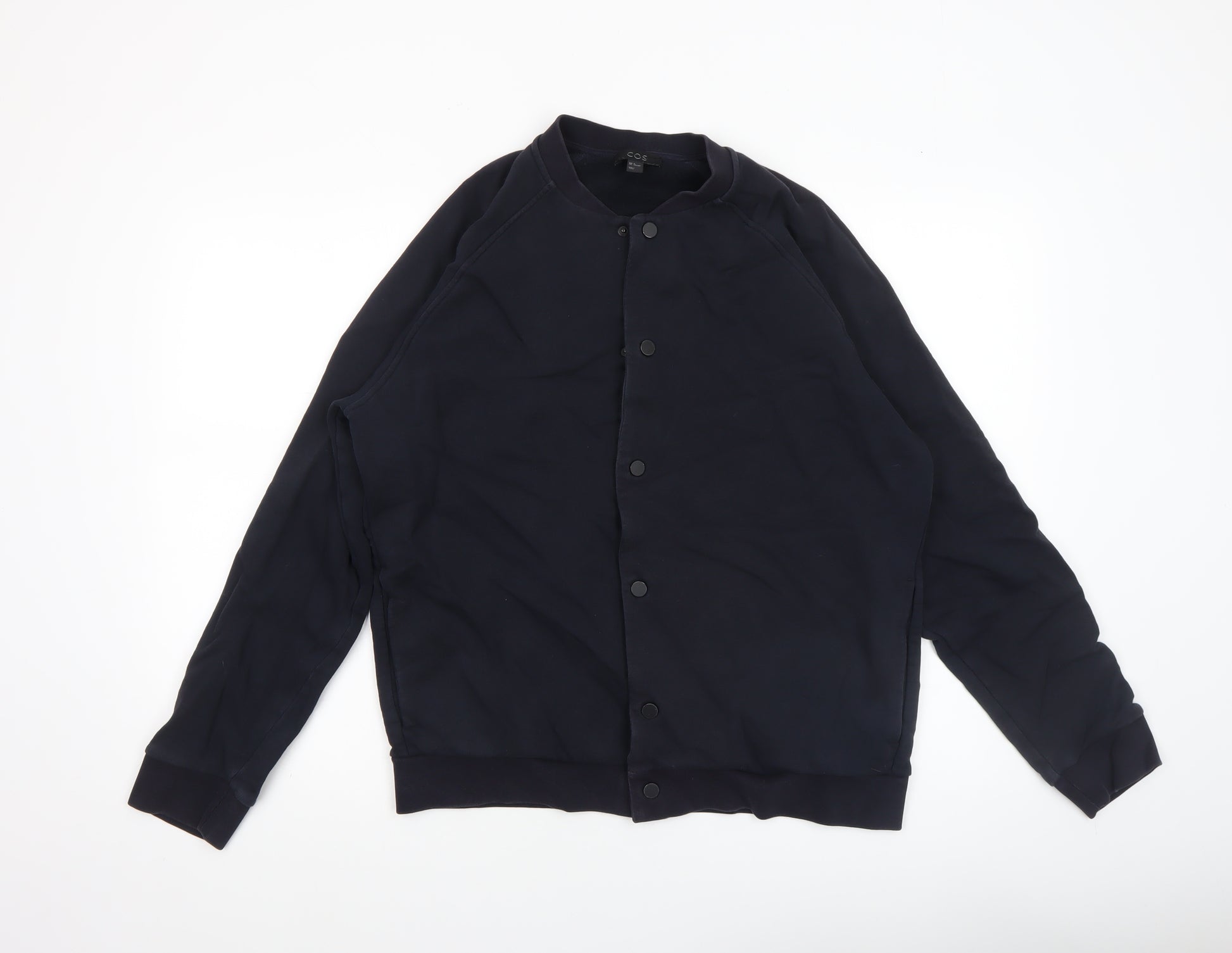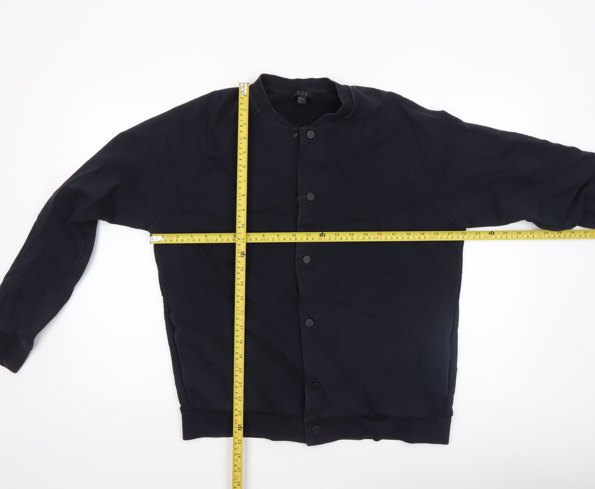 Add understated sophistication to your wardrobe with this COS men's blue bomber jacket. Crafted from a quality cotton and polyester blend, this jacket offers both comfort and durability, making it ideal for year-round wear. The minimalist design features a clean button-up front and a ribbed band collar, cuffs, and hem that create a timeless, structured silhouette. The medium weight makes it perfect for cool spring and autumn days, as well as layering during milder weather. The jacket’s regular fit makes it easy to pair with a range of outfits—from casual jeans and trainers to tailored trousers for a smart-casual look. Designed with discreet side pockets, this piece balances functionality and sleek style. The dark blue hue offers versatility, effortlessly coordinating with both neutral and bold tones in your wardrobe. Inside, the soft jersey-style lining ensures comfort while maintaining a lightweight feel. COS is known for their modern and minimalist aesthetic, reflected in this jacket’s clean lines and simple button closure. Whether you’re dressing up for a relaxed dinner or seeking a refined daily layer, this jacket provides effortless class. In excellent pre-owned condition, showing minimal signs of wear and carefully maintained, it remains ready for years of stylish wear. Its smart design and quality fabrication make it a worthwhile addition for those seeking contemporary yet timeless outerwear. Pair it with chinos and a crisp shirt for a polished look or team it with joggers and a tee for a more laid-back vibe. This COS bomber jacket seamlessly bridges modern design and classic menswear essentials, perfect for elevating your everyday style without sacrificing comfort or practicality.