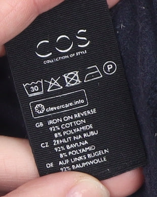 Stay effortlessly stylish and comfortable in this COS Women’s Navy Blue Velvet Pullover Sweatshirt. Crafted from a premium cotton and polyamide blend, this soft-touch fabric feels indulgently smooth while providing flexibility and breathability for all-day wear. Designed with a high neck that keeps you warm during cooler months and long sleeves for a relaxed yet polished silhouette, this sweatshirt effortlessly combines comfort with a modern minimalist aesthetic. The relaxed fit and slight stretch make it perfect for layering over t-shirts or pairing with jeans, trousers, or skirts for a sleek, everyday look.Made in Portugal, the craftsmanship reflects COS’s commitment to quality and sustainable fashion. The simple pullover design with no visible fastenings enhances its clean and sophisticated appearance, while the velvet-like texture adds a subtle touch of luxury. Finished in a deep navy blue shade, it’s versatile enough for day-to-night wear—whether you’re running errands, relaxing at home, or heading out casually on cooler days. Easy to care for and machine washable, this piece is designed for long-lasting style and comfort.This sweatshirt suits women who appreciate timeless minimalist fashion with an emphasis on quality fabrics and refined shapes. Perfect for autumn, winter, and spring use, it feels soft next to the skin yet substantial enough to keep away the chill. With COS’s signature understated design, this versatile staple complements any modern wardrobe. Pair with tailored trousers and trainers for an elevated casual look or tuck into high-waisted jeans for a chic, relaxed weekend outfit.Given its excellent pre-owned condition, this COS navy pullover represents superb value—a premium piece for a fraction of its original retail cost. Ideal for women who seek effortless elegance and comfort in everyday wear.
