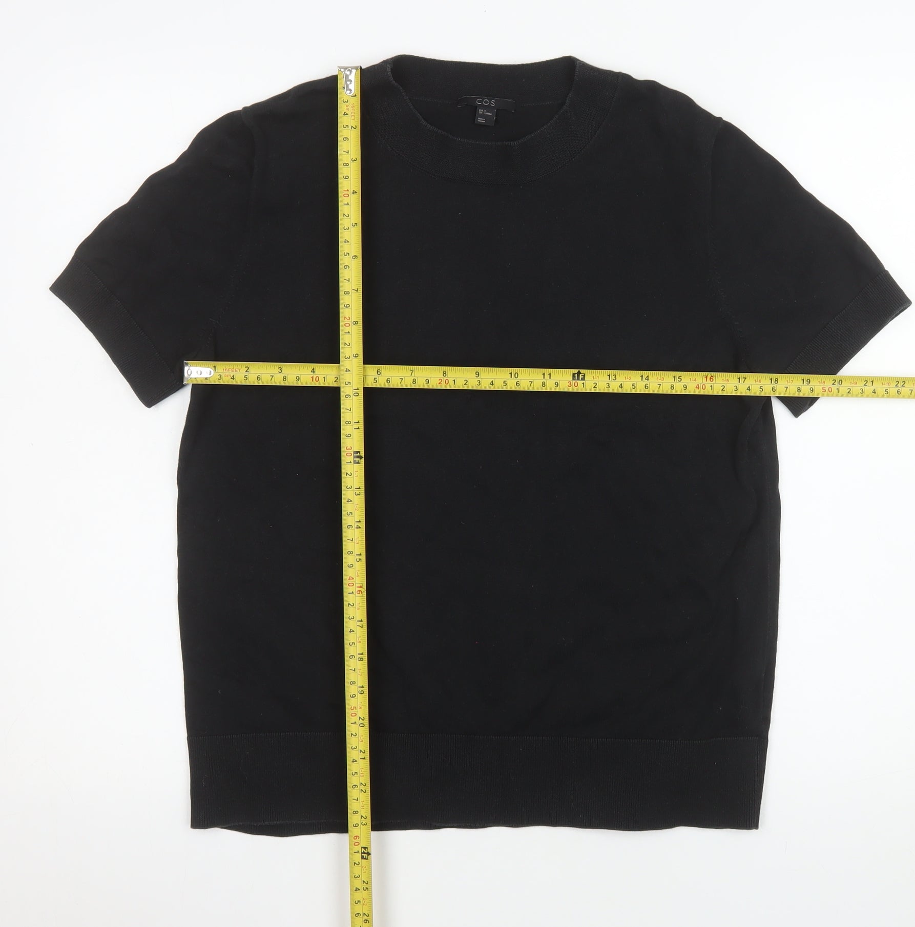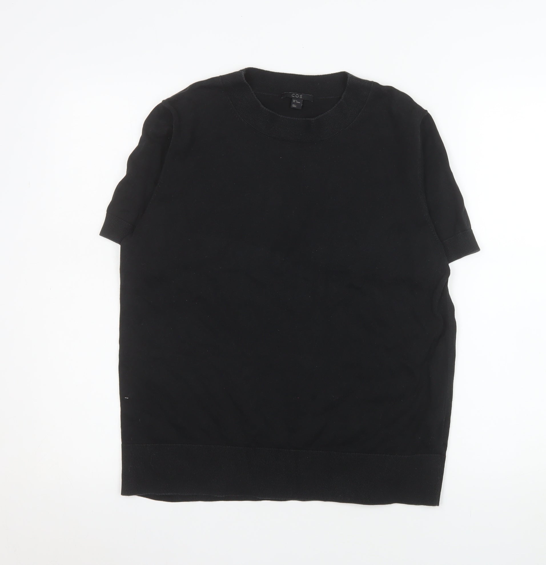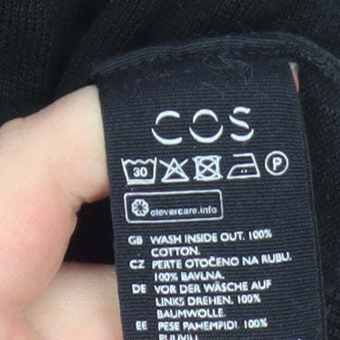 This COS women's short sleeve top embodies the minimalist sophistication the brand is renowned for. Crafted from 100% cotton, the fabric is soft, breathable, and ideal for everyday comfort. The crisp black colour makes this piece endlessly versatile, while the clean crew neckline and ribbed hem and cuffs add subtle structure and refinement. Designed in a classic, relaxed fit, this top offers an effortlessly balanced silhouette that complements a variety of styles and occasions. Ideal for layering under a blazer for a smart-casual look or pairing with jeans for a modern, laid-back vibe. The single-tone finish ensures it integrates seamlessly into any wardrobe, making it a go-to piece that transcends seasons. Its lightweight, easy-care fabric makes upkeep simple and ensures lasting wear. The pullover design enhances everyday practicality, while the simplicity of its shape and finish keeps the focus on quality construction and timeless design—hallmarks of COS. This black cotton T-shirt feels substantial yet breathable, offering comfort throughout spring, summer, and even the cooler months when layered. With no embellishments or patterns, its minimalistic aesthetic reflects understated luxury, suitable for both casual outings and effortless chic styling. This item is in excellent pre-owned condition, showing only minimal signs of gentle wear and no visible flaws or marks. Ideal for those who appreciate premium essentials with a refined finish, this COS black cotton top delivers versatility, simplicity, and durability in one sophisticated staple, guaranteed to elevate any capsule wardrobe.