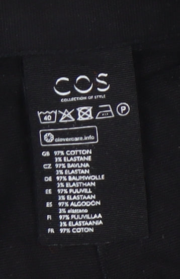 Discover stylish comfort with these COS Women's Black Wide-Leg Trousers, perfect for enhancing your casual wardrobe. Crafted from a breathable 97% cotton and 3% elastane blend, these trousers promise a relaxed fit and exceptional ease of movement. The sleek black colour seamlessly pairs with various tops, while the wide-leg style adds a touch of modern flair. Featuring a flat front and accented by buttons, these trousers offer both functionality and a chic aesthetic. Whether you're heading to a casual outing or lounging at home, these trousers are designed to meet your everyday needs. Despite showing minimal wear, they are in excellent condition and ready to be your go-to piece for versatile fashion. Machine washable for effortless care. Elevate your style effortlessly with these classic trousers, tailored for women who value comfort and style.