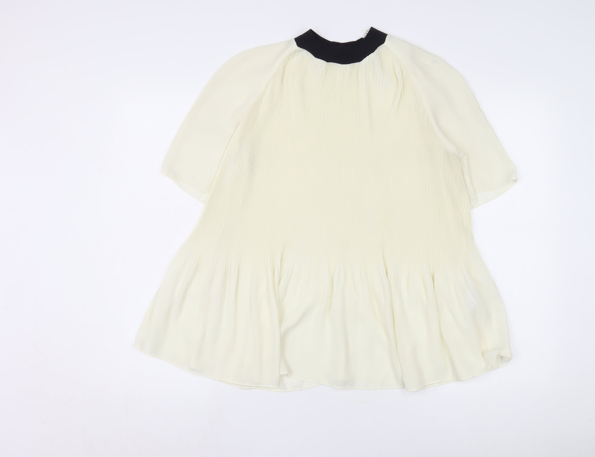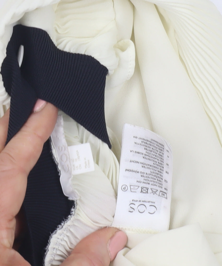 Elevate your wardrobe with this elegant COS women's blouse in a sophisticated ivory hue. Designed with a modern kimono style, this blouse features short raglan sleeves, offering a relaxed yet stylish fit. The high neckline adds a touch of class, making it perfect for casual outings during spring and summer. Crafted from lightweight chiffon fabric, the blouse drapes gracefully, providing a chic silhouette. Made entirely from durable polyester, it ensures comfort while being easy to maintain, as it's machine washable. Ideal for women seeking a vibrant addition to their attire, this solid pattern blouse can effortlessly pair with jeans or skirts for a versatile look. With no embellishments, its minimalist design makes it a perfect choice for those who appreciate understated elegance. In very good condition, this blouse promises years of fashion-forward wear without any visible defects. Priced at £35.00, this stylish piece from COS offers an excellent opportunity to refresh your style with a touch of contemporary sophistication.