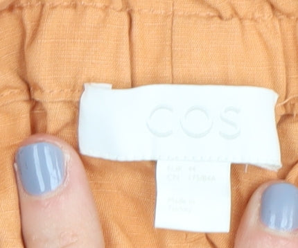 Step out in style with this vibrant orange skirt from COS, perfect for adding a pop of colour to your wardrobe. Designed for women who appreciate both comfort and chic aesthetics, this knee-length skirt is crafted from a high-quality blend of 78% Lyocell and 22% Linen, ensuring a light and breathable fit ideal for warm summer days. The skirt features a classic straight and pencil style, offering a sleek silhouette that's complemented by an easy-going elastic waistband with a functional drawstring, making it a versatile choice for casual outings or relaxed weekend wear. Its simple yet elegant design is free of patterns, allowing you to pair it effortlessly with a variety of tops and accessories. This machine washable skirt is in excellent condition, with only light wrinkles that do not detract from its overall appearance. Grab this stylish piece today to elevate your summer collection and enjoy a blend of comfort and vibrant style!