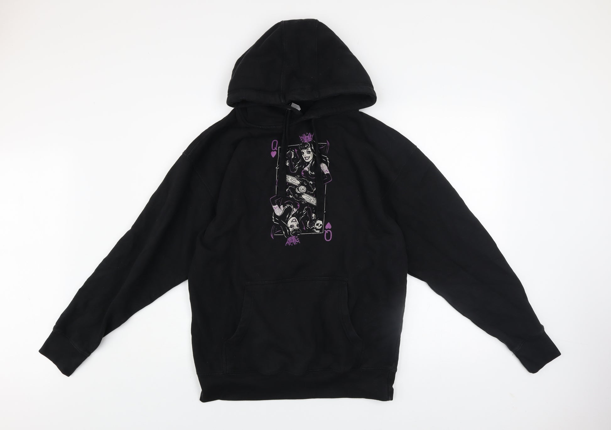 Elevate your casual wardrobe with this Cotton Heritage men's black pullover hoodie, a perfect combination of comfort and edgy streetwear style. Crafted from a soft blend of 65% cotton and 35% polyester, this fleece fabric hoodie provides warmth and durability while maintaining a comfortable, breathable fit ideal for everyday wear. Designed in a classic pullover style, it features a drawstring hood and a front kangaroo pocket, combining practicality with relaxed design for a timeless look. The standout feature is the bold front graphic depicting an artistic playing card Queen design accented with subtle skull details in purple tones — giving the hoodie an alternative, expressive vibe that makes a striking statement. The long sleeves and crew neckline enhance comfort, while its ribbed cuffs and hem ensure a secure fit that helps to keep in warmth. With a regular fit, this piece accommodates easy layering and provides freedom of movement. Whether you're pairing it with jeans for laid-back weekends, or joggers for a cosy street-ready outfit, this hoodie transitions effortlessly between casual outings and relaxed home days. Machine washable for easy care, it’s made for long-lasting wear and simple maintenance. In very good pre-owned condition with only minimal signs of use, this hoodie remains vibrant and ready for a new wardrobe rotation. Ideal for the autumn, winter, and spring seasons, it’s a versatile addition that delivers both comfort and character. Perfect for those who appreciate graphic statement wear and quality craftsmanship, this Cotton Heritage hoodie combines everyday practicality with a modern, rebellious edge that ensures you stand out in comfort and style.